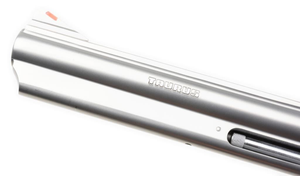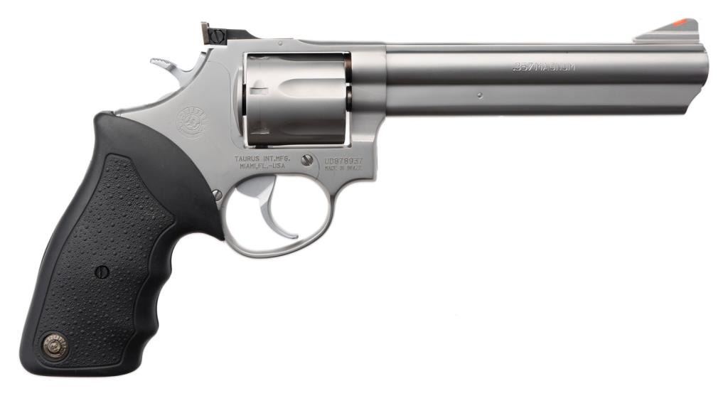 *Taurus revolver, .357 Magnum cal., serial #455566. The pistol is in overall very good to nearly excellent condition with a 6” barrel, ramp front with orange insert and adjustable rear sights. The pistol retains nearly all of itsmatte stainless finish with only slight handling marks evident. The rubber Taurus marked combat grips are in very good condition showing minimal use. The bore is very good, the action crisp and markings are excellent on this pistol. Est.:$300-$600.