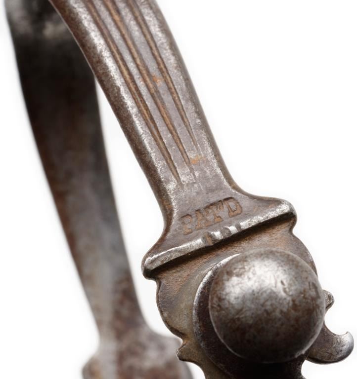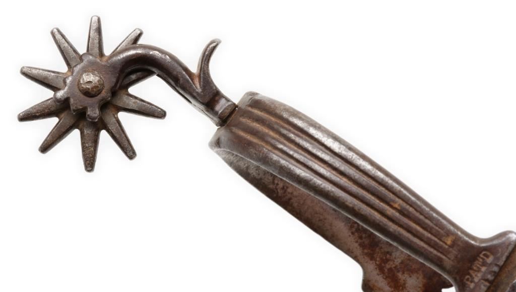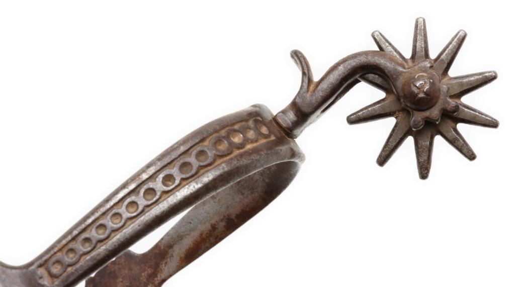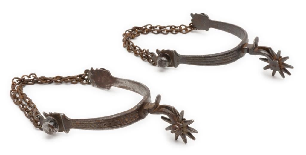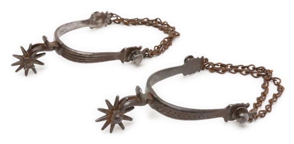 Lot 1341 Unmarked iron spurs with 1-1/2” 10 point rowels and heel chains; heavy dark patina. Est.: $300