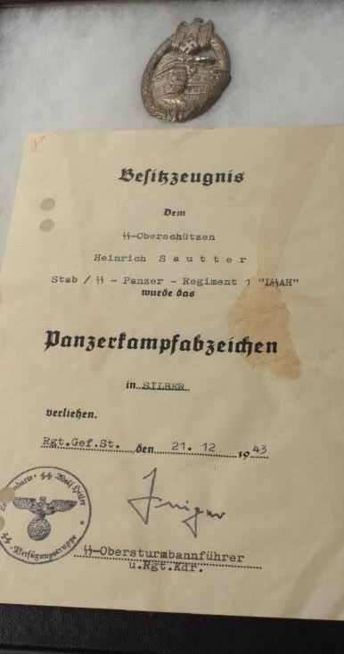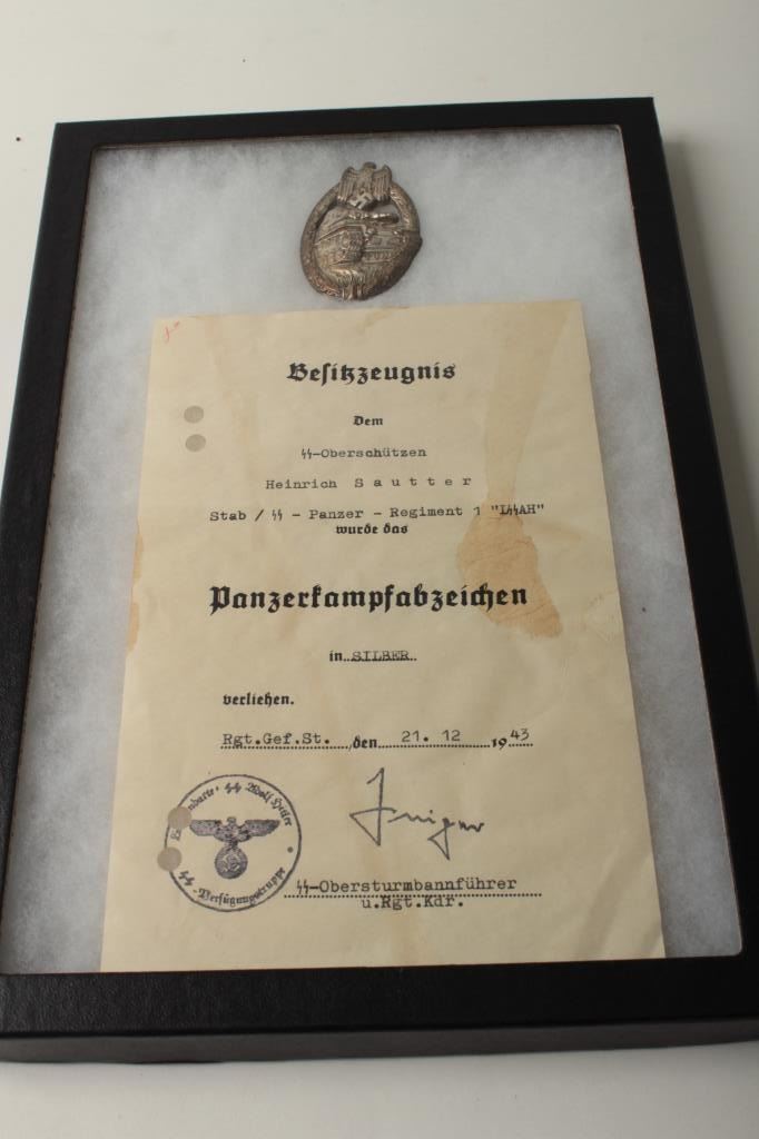 Silver Tanker’s Badge from First Panzer Regiment, in riker case with 1943 dated certificate in German; awarded to Heinrich Sautter. Est.: $400-$800.