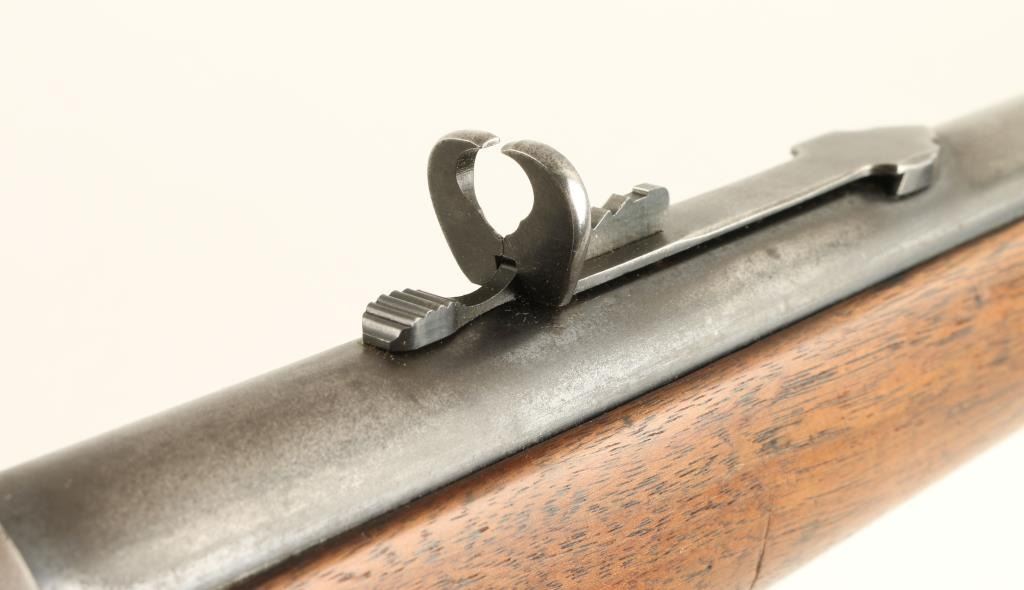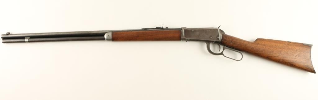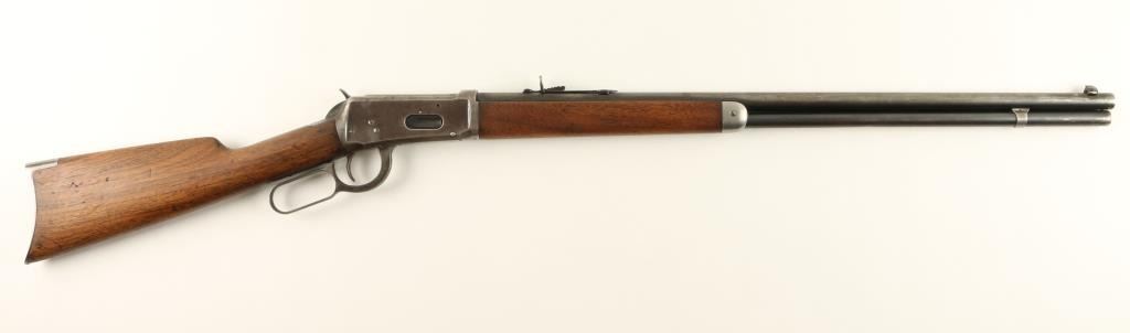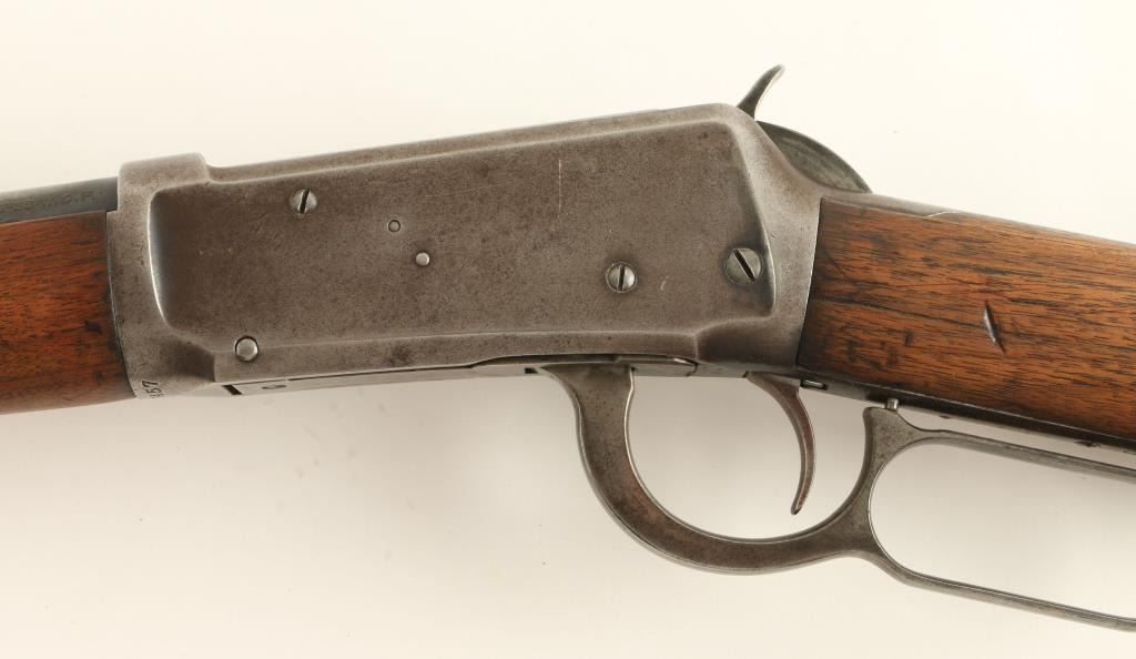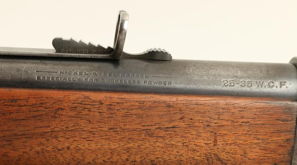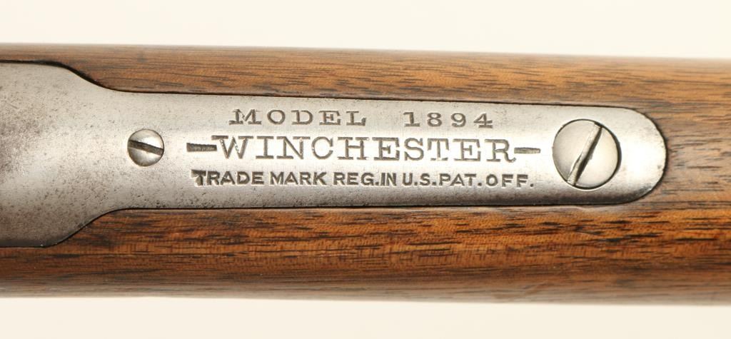Winchester Model 1894 lever action Rifle, 25-35 WCF cal., serial #507457. The rifle is in overall very good condition with a 26” round barrel, period blade front sight and buckhorn rear. The barrel retains approximately 50% of its thinningblued finish, while the magazine tube has 70%. The receiver retains approximately 10% of its blued finish in protected areas with the remainder going to a silver-grey patina with light surface rust evident. The smooth wood stocks are inoverall good condition having been lightly sanded at some point, showing typical small mars and compressions. The butt ends with a metal crescent buttplate. The bore is good, the action crisp and markings clean on this Winchester manufactured in 1910. (C+R) Est.: $800-$1,600.