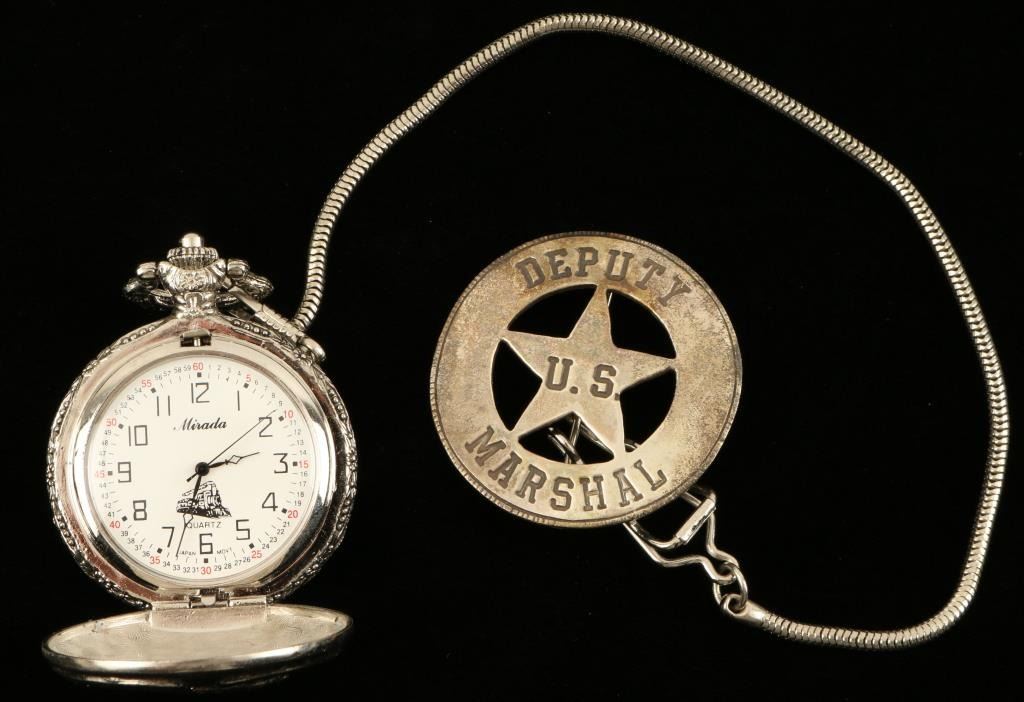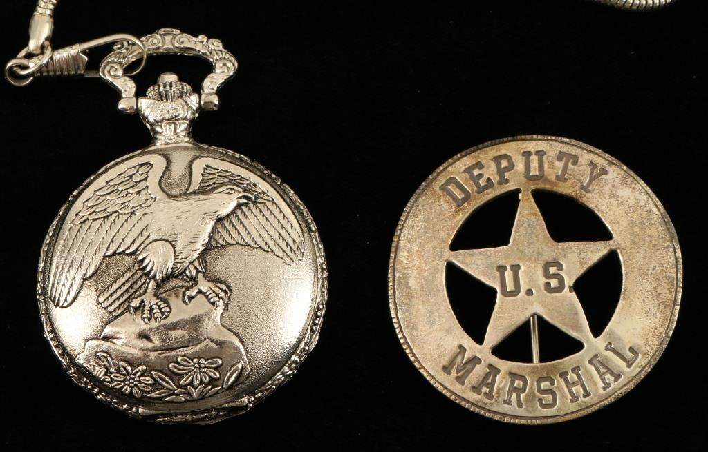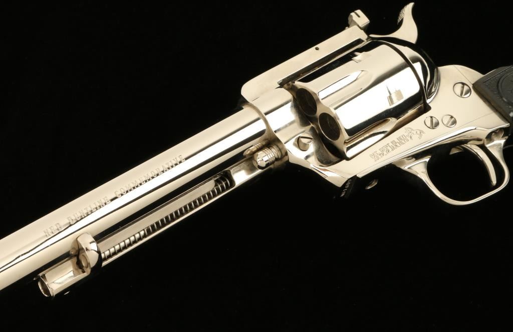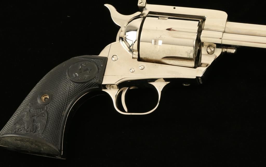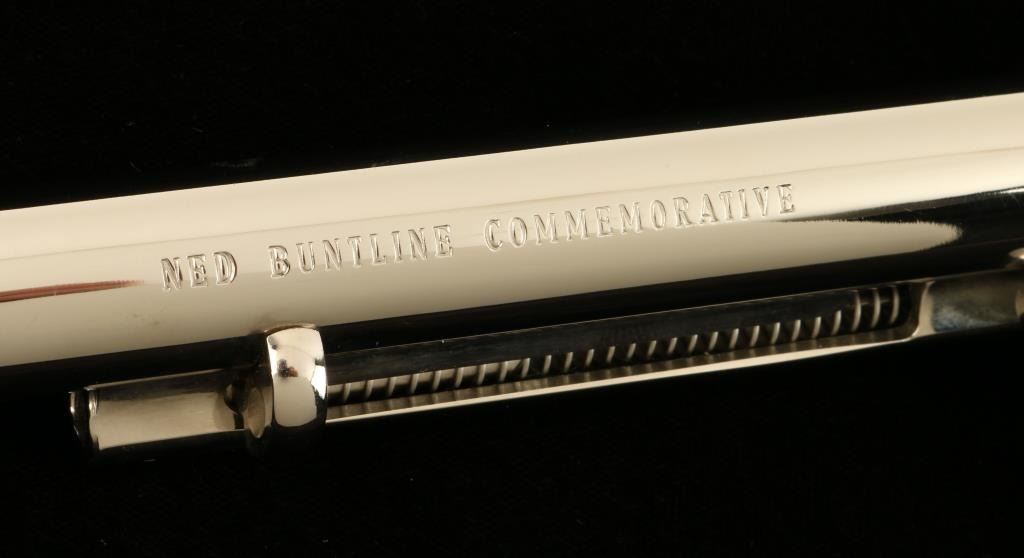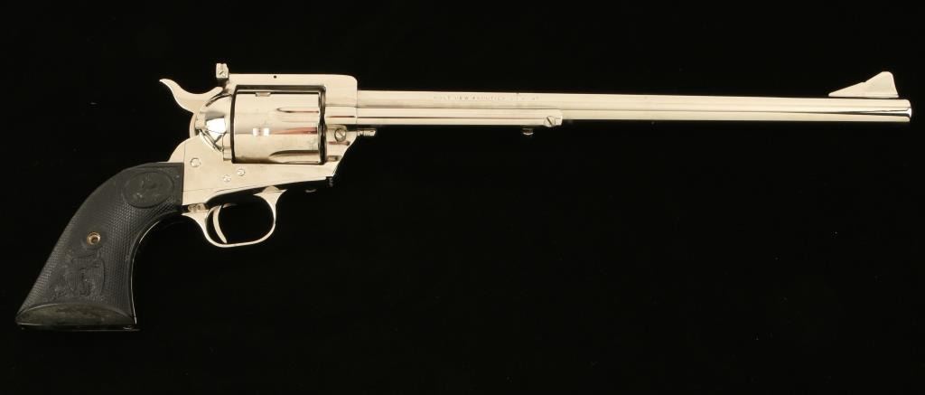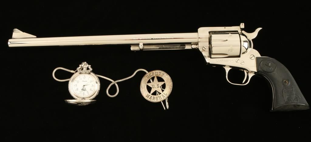 Colt New Frontier Single Action Ned Buntline Commemorative Flat Top target revolver, .45 cal., 12” barrel, nickel finish, checkered hard rubber eagle grips, S/N NB1609. This revolver remains in excellent condition showing little to no use. Thegrips are in excellent condition with sharp checkering. The action is crisp and the bore is excellent. Accompanied by a wood display case which is missing its glass cover, a reproduction U.S. Marshal badge and also a pocket watch made by Mirada showing an eagle on the front and is not working at time of description. (C&R/PPT). Est.: $800-$1600
