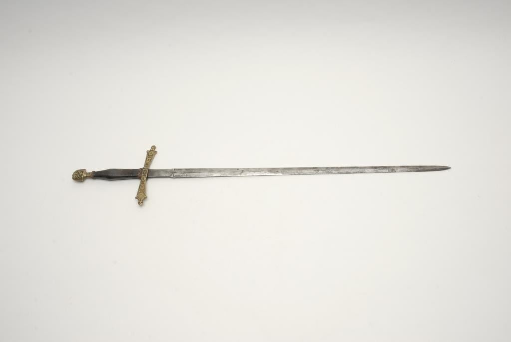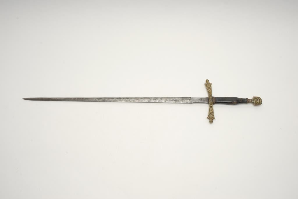 Lot 1364a Knightly sword in 17th century style showing makers mark on the blade with cast brass mounts and l