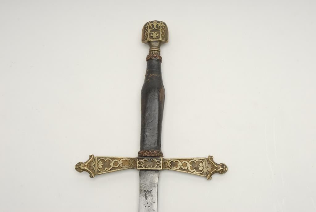 Knightly sword in 17th century style showing makers mark on the blade with cast brass mounts and leather grips with copper wire wrap. The sword measures 42” with a 33 ¼” blade. Shows age but possibly a Victorian assemblage using older bladeand very authentic in styling, balance and weight. Est.: $500-$1000