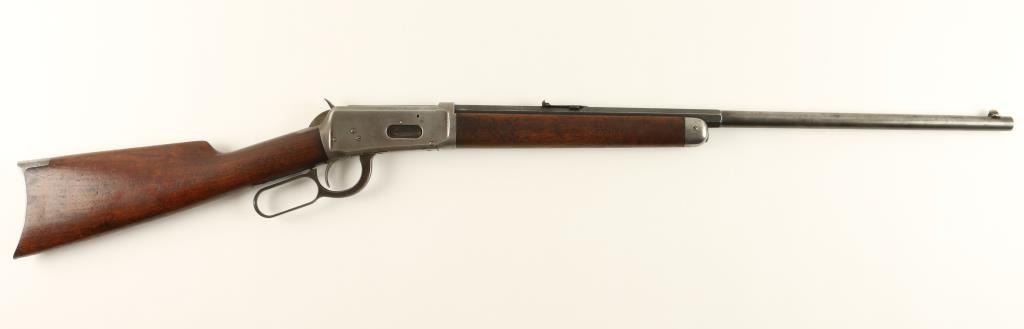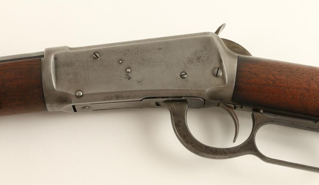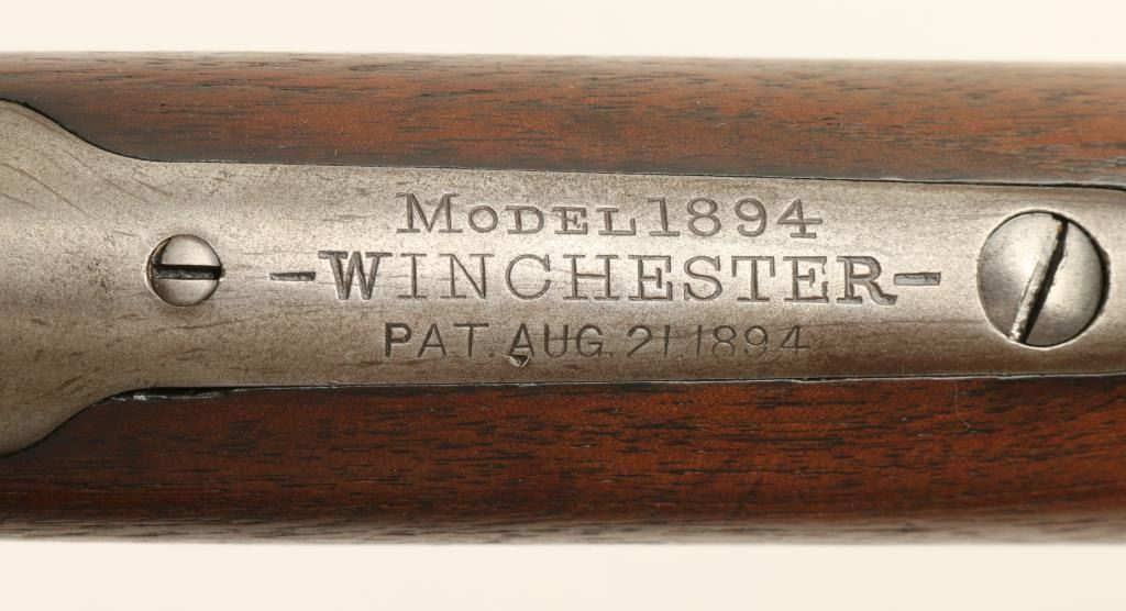 Winchester Model 1894 lever action rifle with special features; .30 W.C.F. caliber, 25” half round/half octagon barrel, “button” half magazine, S/N 182988, blued finish, wood stocks in overall very good condition displaying ample areas oforiginal blue on the barrel, crisp action, good bore and markings, good to very good wood stocks with scattered minor old mars and scratches from carry and storage. (C&R). Est.: $900-$1,800.