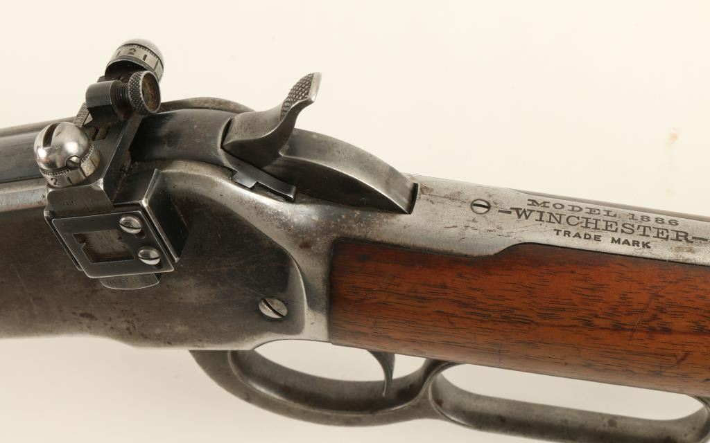 Winchester Model 1886 lever action rifle, .33 W.C.F. caliber, 24” round barrel, S/N 133063, blued finish, wood stocks in overall very good condition showing scattered original finish in protected areas with balance gone to a light greypatina; good bore, very good markings, crisp action and Redfield adjustable receiver mounted rear sight; overall good wood with evidence of an old light surface cleaning. (C&R). Est.: $1,400-$2,800.