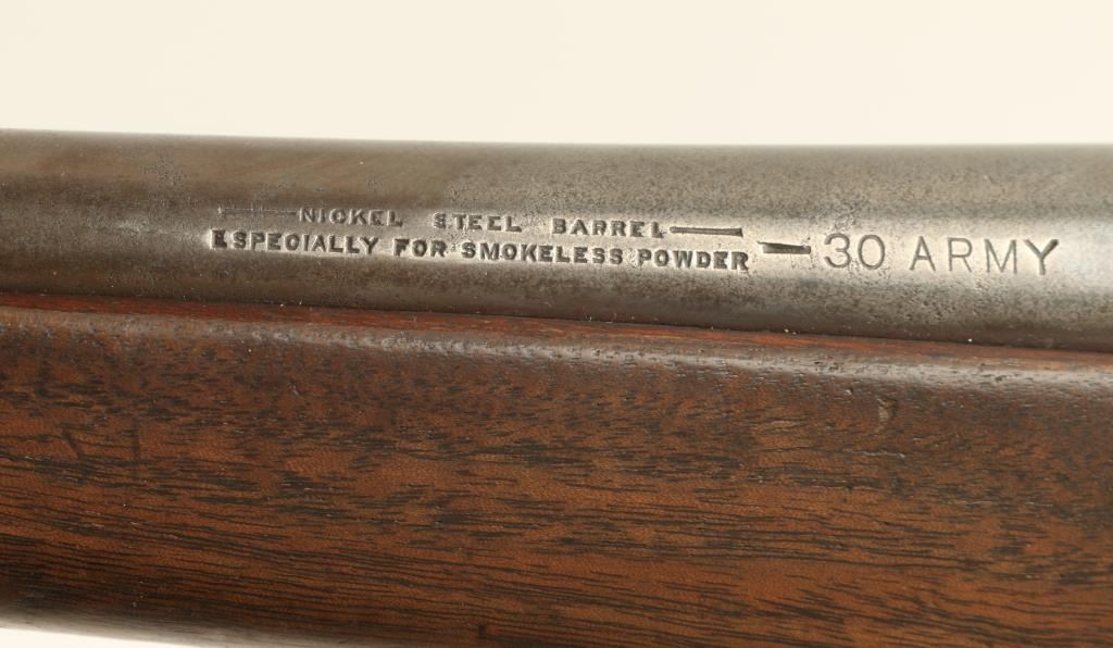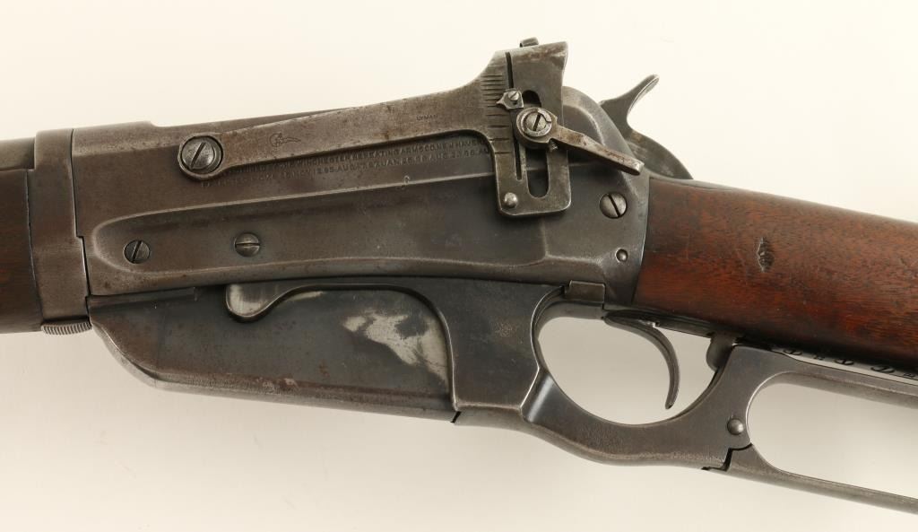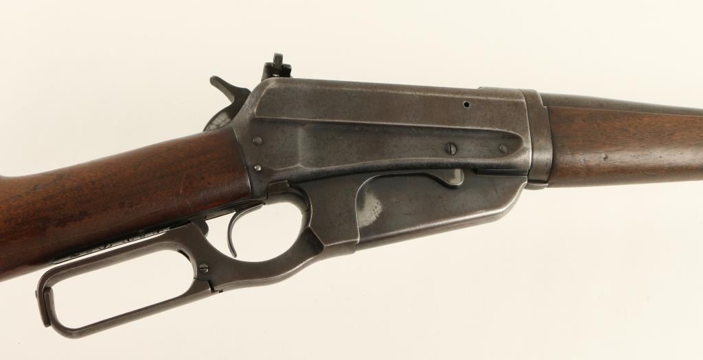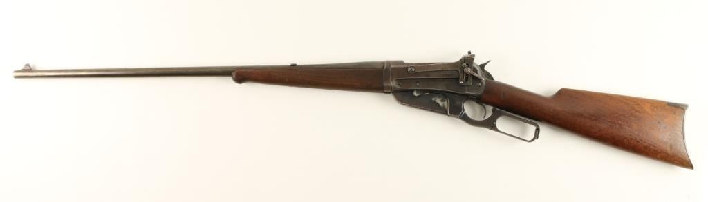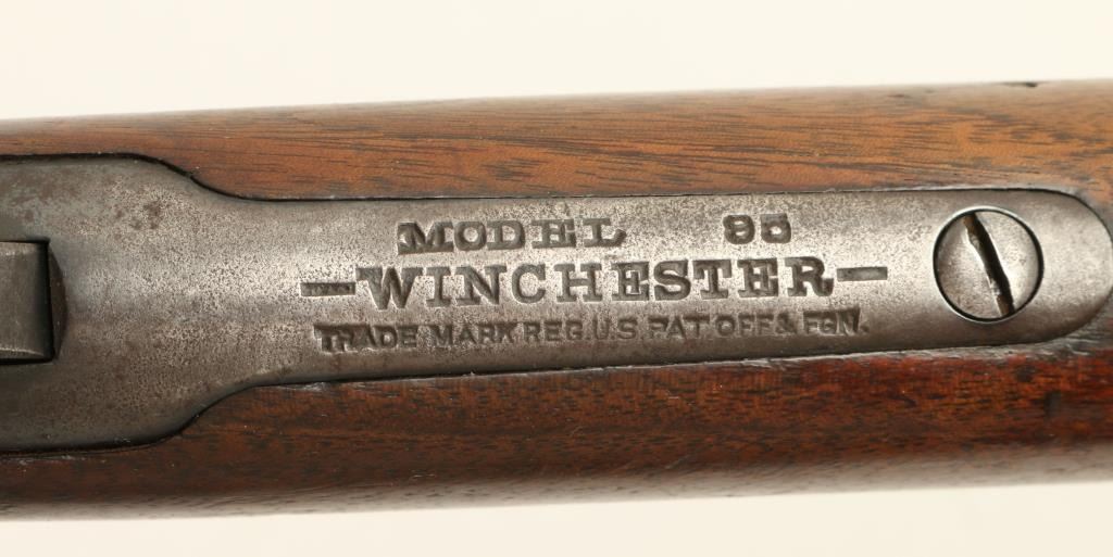 Winchester Model 1895 takedown lever action rifle, .30 Army cal., serial #412382. The rifle is in overall very good condition with a 28” blued barrel with a blade front sight, rear sight removed and period Lyman receiver sight added.The barrel retains a significant amount of thinning blued finish with the remainder going to patina. The receiver and lever show considerable blued finish with light surface rust and the balance going to plum patina. The smooth woodstocks are in overall good condition with considerable loss of finish and small mars evident. The butt stock ends with a metal crescent butt plate. The bore is good, the action crisp and markings sharp on this desirable Model1895 takedown. (C+R) Est.: $1,400-$2,800.
