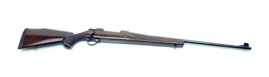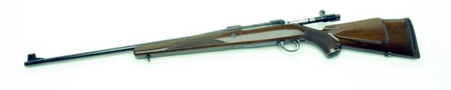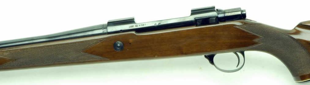 Sako bolt action rifle, .264 Mag. Cal., serial #4581. The rifle is in overall nearly excellent condition with a 24” blued barrel featuring a hooded, ramp front sight. The barrel and action retain nearly all of their original polished bluefinish. The action is marked, “L61R” on the left side of the receiver. The finely checkered wood stocks are in very good condition with only small marks from handling evident. The stock shows a high gloss finish with sling swivels and a Sakomarked ventilated rubber pad. The bore is excellent, the action crisp and markings are sharp. A real nice Sako that has seen little use in a great caliber. Est.: $600-$1,200. (Modern).