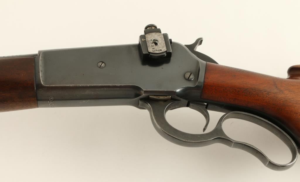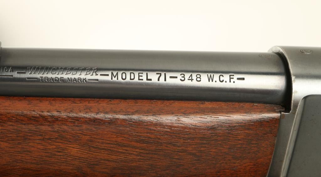 Winchester Model 71 lever action rifle, .348 W.C.F. caliber, 24” round barrel, S/N 35970, blued finish, Lyman adjustable receiver mounted rear sight, wood stocks in overall fine condition displaying the majority of its original finish,fine bore, crisp action and markings, overall fine wood with a couple scattered minor mars from storage. (C&R). Est.: $1,400-$2,800.