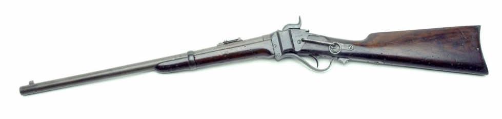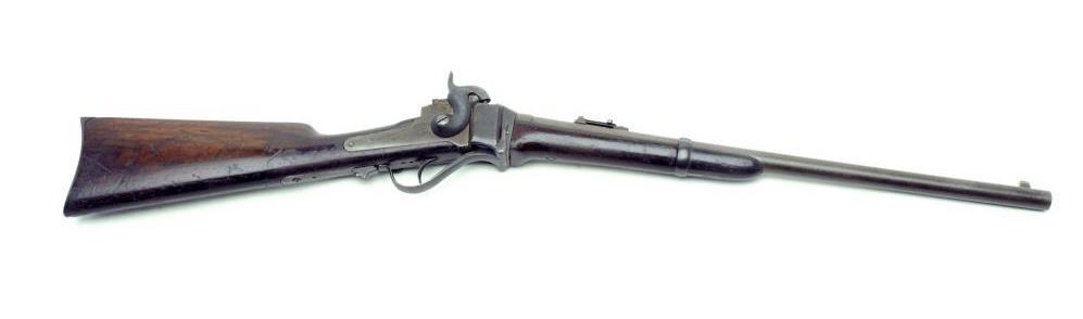 Sharps New Model 1859 percussion SRC , .52 caliber, 22” barrel, S/N 43187 in overall good condition displaying a grey/brown patina on metal surfaces with areas of old pitting, crisp action, good rifling in bore, overall good wood thatdisplays scattered old mars, dings and scratches from carry and storage. Accompanied by a handwritten note from the consignor stating the piece was found 60 years ago within 15 miles of the Mansfield, LA. Battlefield and had been in aConfederate soldier’s family. Consignor also notes “probably captured from 2nd N.Y Veteran Cavalry “as Union troops in the battle were armed with Sharps carbines. (Antique). Est.: $1,750-$3,500.