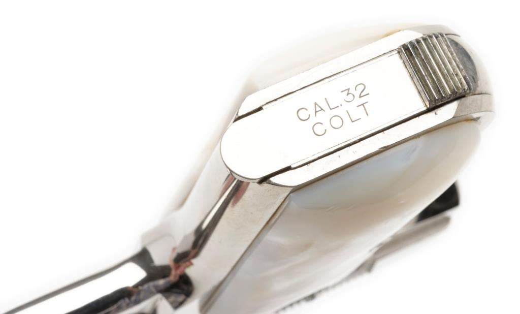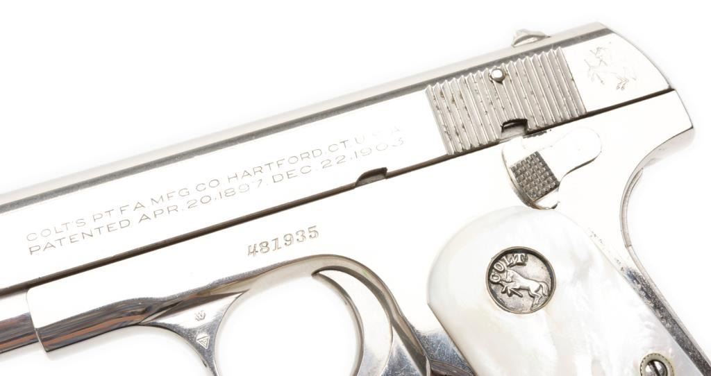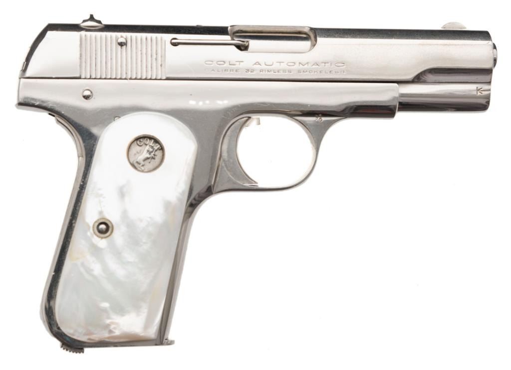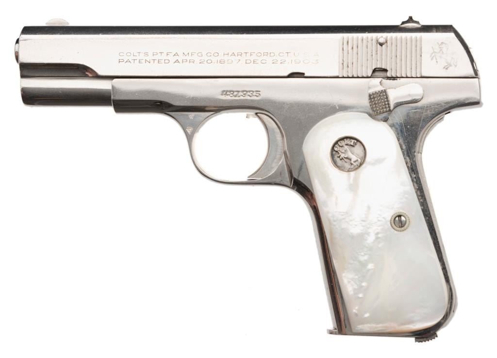 **Colt Model 1903 semi-automatic pistol, .32 caliber, 3.75” barrel, S/N 481935, nickel finish, thick pearl medallion grips in overall very good condition as professionally re-nickeled long ago; very good to fine bore, crisp action, very goodmarkings and fine grips. Est.: $600-$1,200.