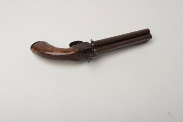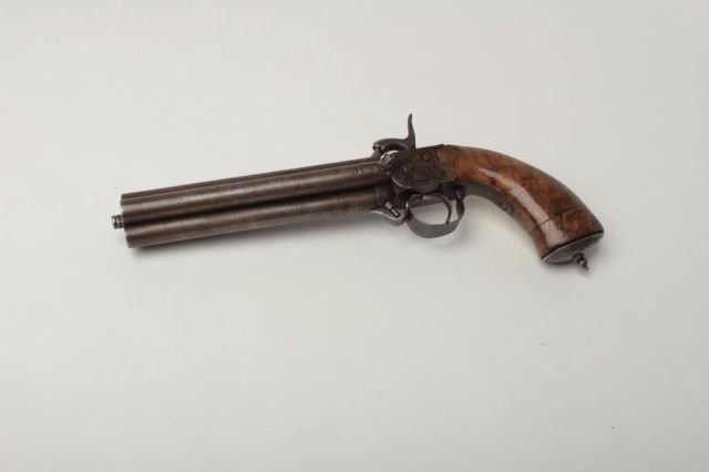 Lot 1409 Revolving Four Barrel Percussion Pistol, .38 caliber, four 6 3/8" barrels numbered 1-4. The barrel
