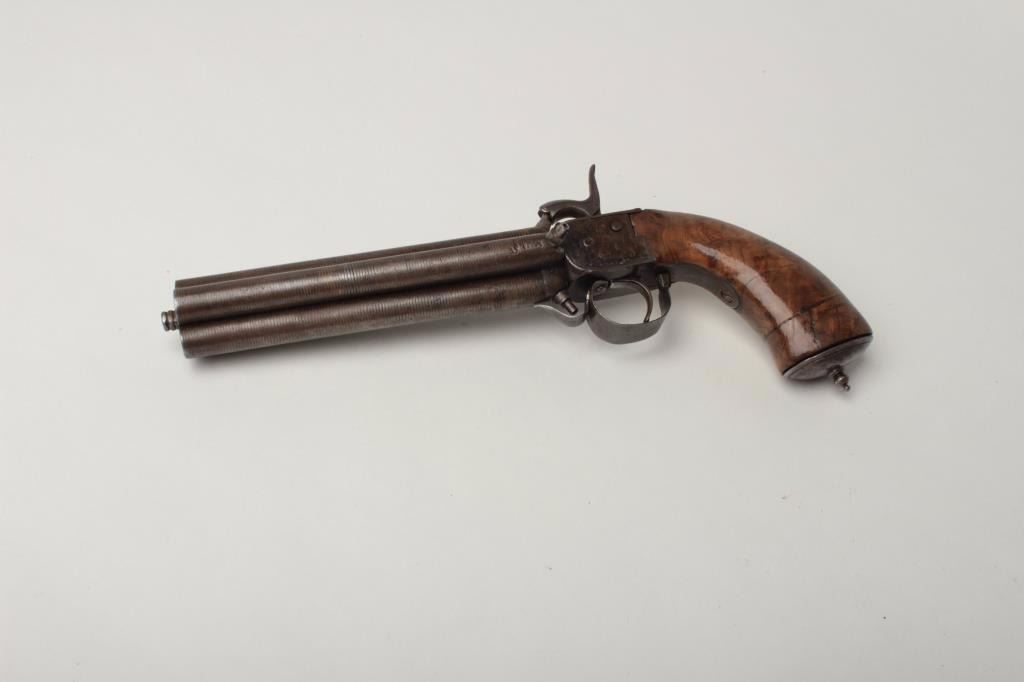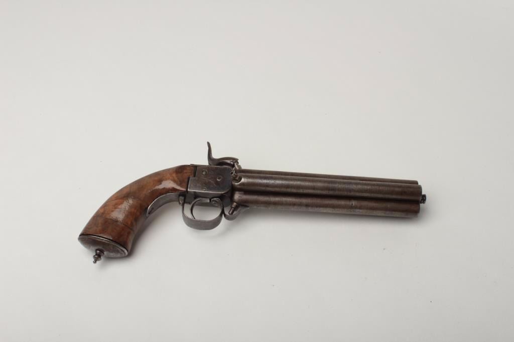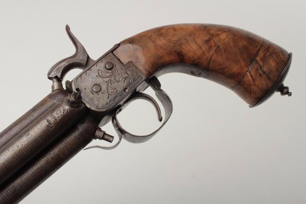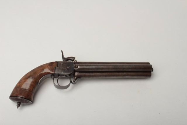 Revolving Four Barrel Percussion Pistol, .38 caliber, four 6 3/8" barrels numbered 1-4. The barrels feature exposed nipples at the breech, and revolve by hand. The hammer is mounted in the top center of the frame, which features scrollengraving. The iron triggerguard is also engraved and features a spur that acts as a nipple guard. One piece burl wood grip with an iron butt cap. All metal parts with a grey and plum patina. The burl wood has a circular repair at the base. thebutt cap is loose. Mechanically functional. Est:$700-900