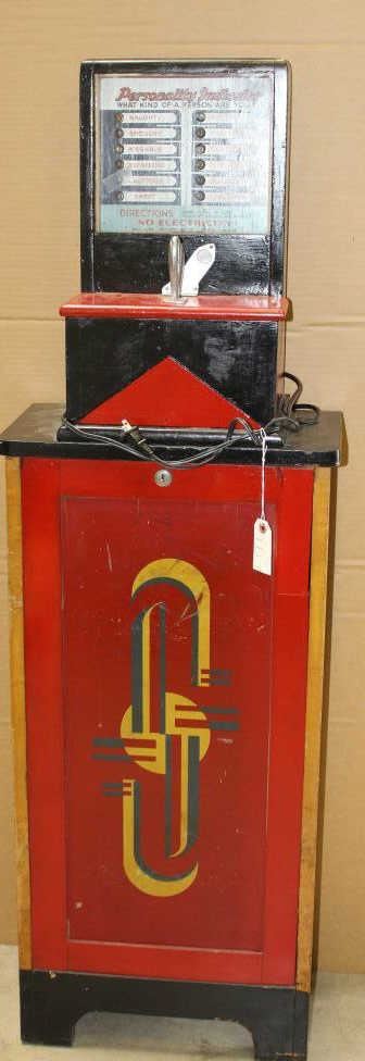 1930’s era Personality machine (measures “Personality” by strength of grip that is squeezed after dropping in coin); approximately 55” in height, 18” in width and 10” deep; seen during its time in bars, eating establishments andcarnivals; unknown working condition. Est.: $1,000-$1,500.