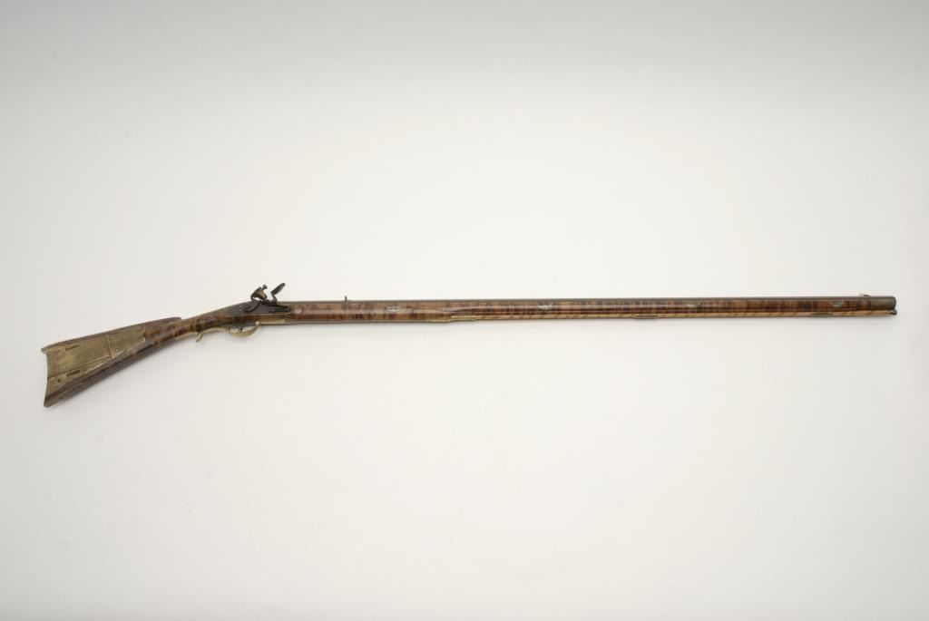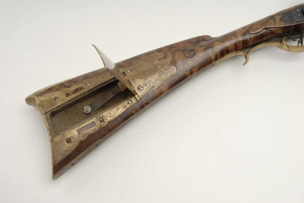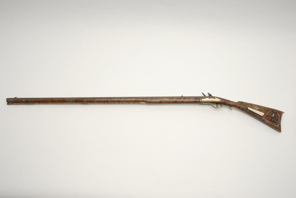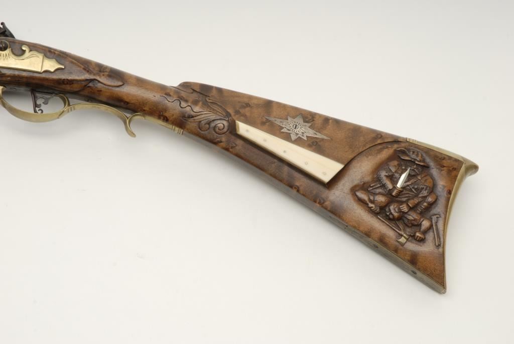 Flintlock Kentucky style rifle custom made by “M.T. Koval, 1973”. Measures 60” overall with a 46” barrel in .45 caliber rifled. Nicely styles with engraved American Eagle patch box and raised carved scene of frontiersman scalping NativeAmerican with bowie. Excellent condition. (Antique) Est.: $1500-$3000+