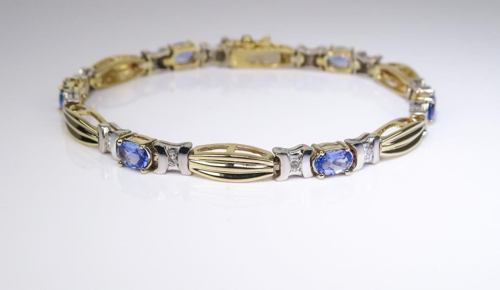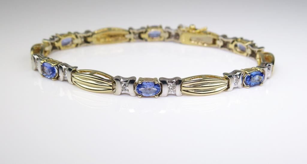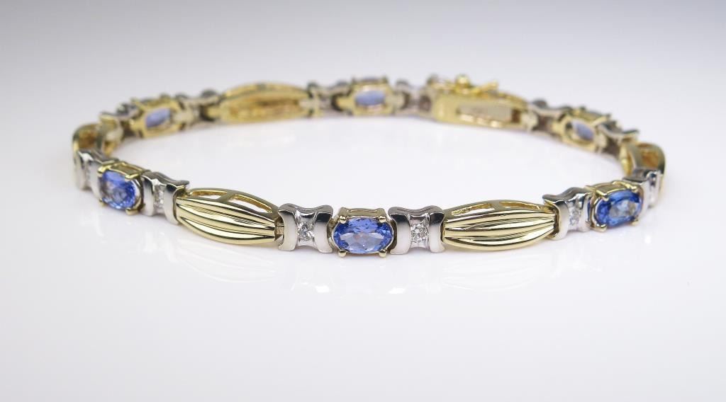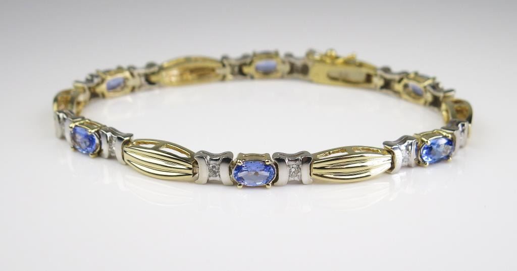 Wonderful FINE quality ladies bracelet set with six oval Tanzanites weighing approx. 3.50 – 4.00 carats accented with 12 round ‘IDEAL’ cut diamonds weighing approx. 0.30 carats of G-H colors and VS clarity set in a 14 karat two-tone gold setting. Retail $3,000-$4,000 Estimate $2,000-$3,000 Nice