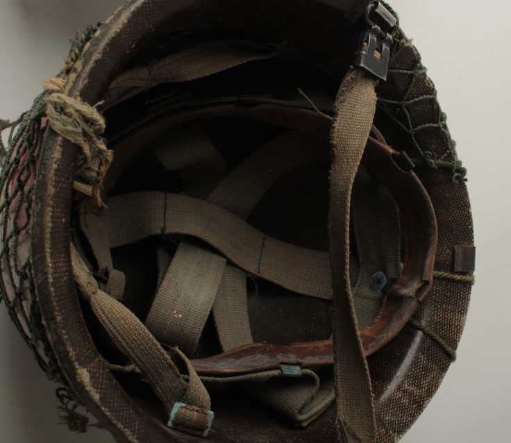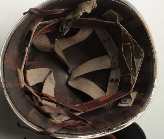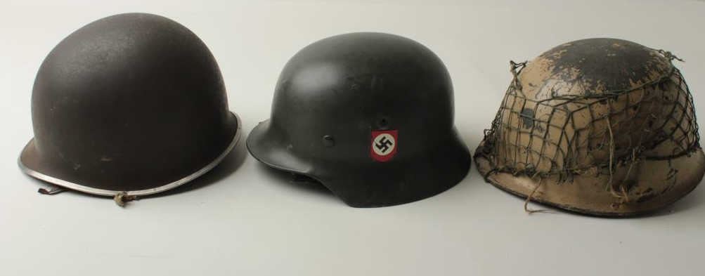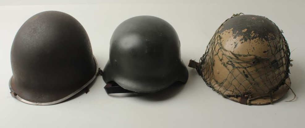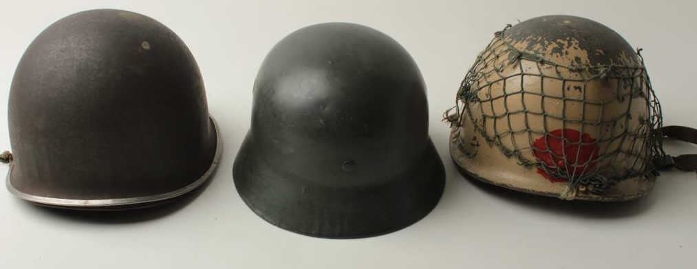 Lot of 3 military helmets including a good reproduction of an SS helmet, possibly a movie prop; a U.S. helmet with liner (split lip at front) and a fiberglass helmet with red meat ball, possibly Japanese or a prop. Est.:$200-$400.