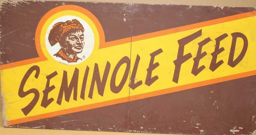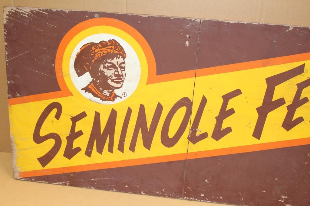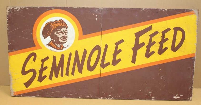 Large fiberboard painted sign advertising “SEMINOLE FEED”, approximately 24” x 48” in overall good condition showing some wear, etc. Est.: $300-$400.