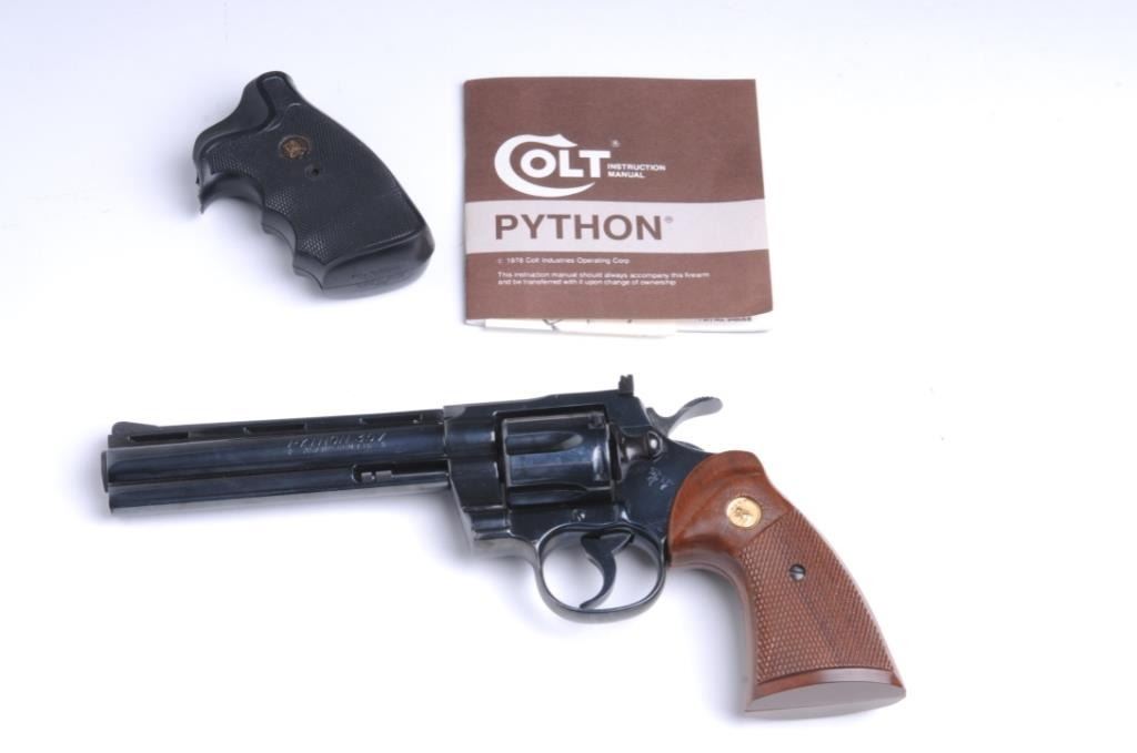 Colt Python .357 DA revolver with a 6” barrel, blue finish, medallion wood grips, S/N LA2595 with 1980 receipt to our consignor, lists extra rubber grips and box ammo purchased. Original manual and Colt companion papers. In excellent condition.99% to near mint. Our consignor never shot the entire box of ammo purchased with this gun. He estimates 30 rounds. (Modern/PPT) Est.: $2750-$4750