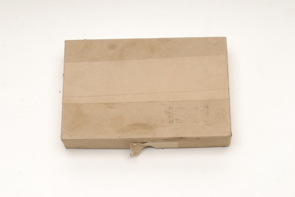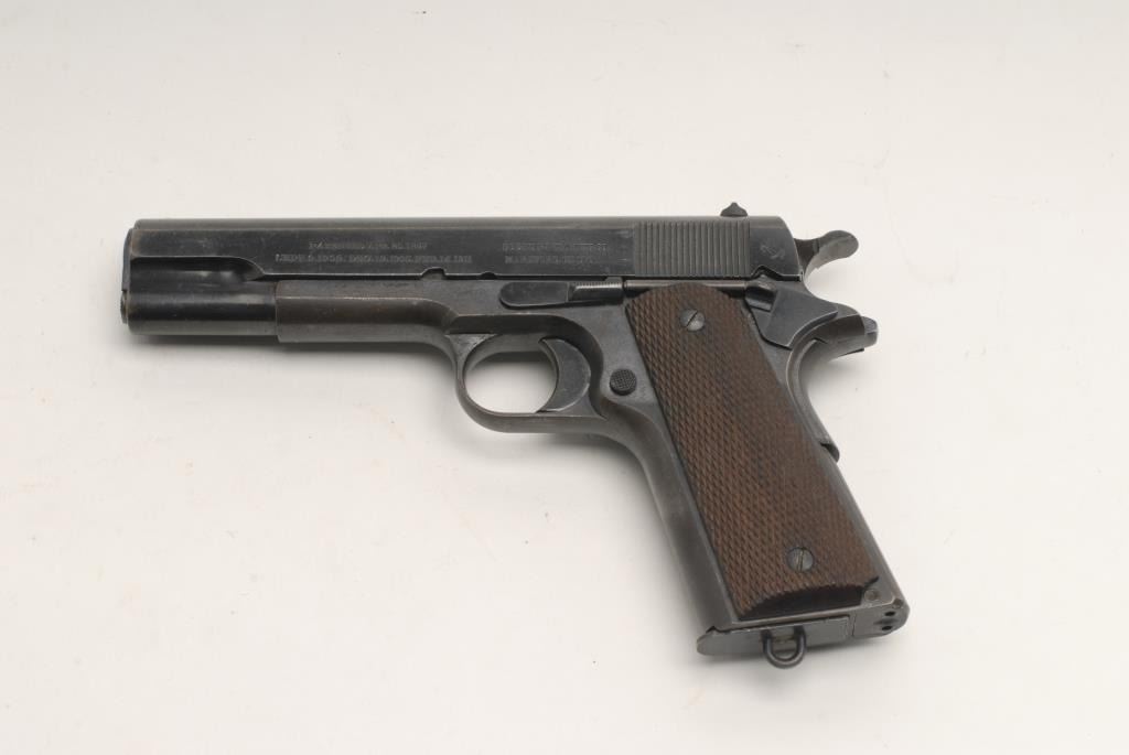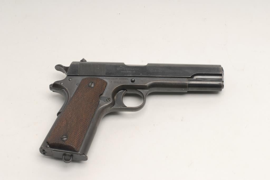 Colt Government Model 1911 semi-automatic pistol, .45 caliber, 5” barrel, S/N C11512, right side of slide stamped “MARINA ARGENTINA”; blued finish, checkered wood grips, lanyard ring two-tone magazine; fair to good bore with strong riflingand scattered pinprick pitting, crisp action, sharp markings, considerable finish remaining, particularly on the slide with the frame showing a more muted blue and plum colored patina; very good grips. A hard variation to find; accompanied by a cardboard “Kraft” two-piece box. (C&R). Est.: $2,500-$3,500.