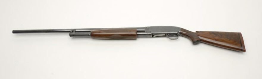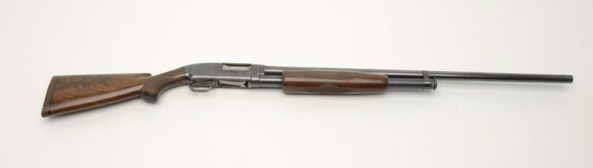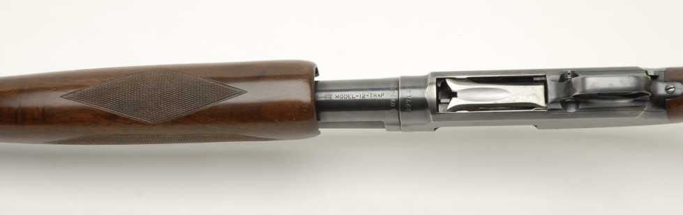 Winchester Model 12 pump action shotgun, 12 gauge, serial #1071290. The shotgun is in very good overall condition with a 30” factory trap, raised rib, non-ventilated, full choke barrel with an ivory bead front sight. The barrel, magazine andreceiver retain nearly all of their thinning blued finish with light surface erosion and wear on the underside of the action. The finely checkered wood stocks are an older re-stock and remain in very good condition with small mars andcompressions consistent with field use. The wood exhibits superior figure and graining, especially in the butt stock. The red rubber Winchester butt pad provides a 13 ¾” LOP. The bore is very good, the action crisp and markings are sharp. Est.:$300-$600. (C+R).