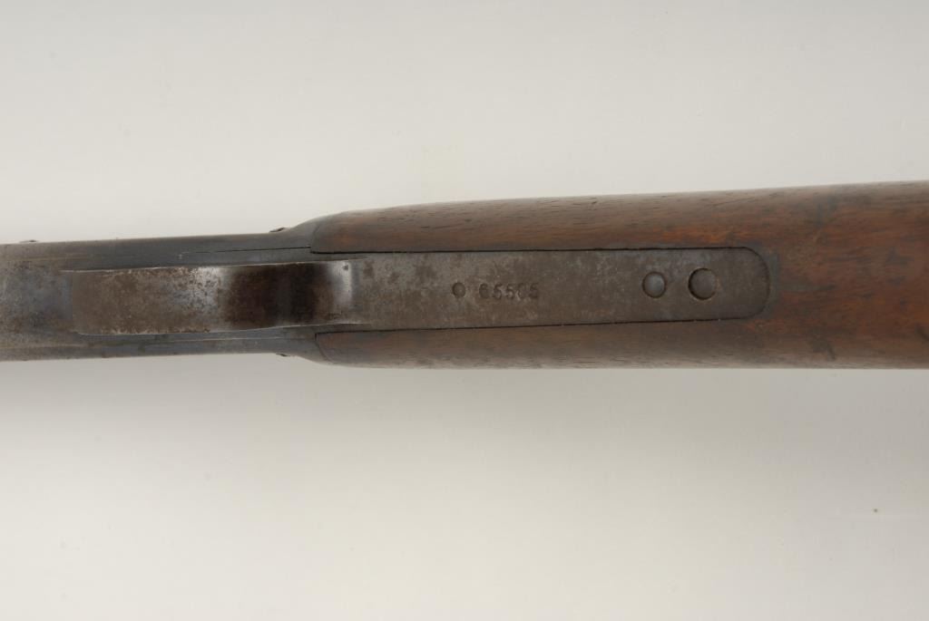 Colt Small Frame Lightning pump action magazine rifle in .22 caliber, S/N 65505 with octagon barrel. 50%-60% original blue thinning on the edges, with very good wood, good markings, and good action. Original butt plate intact. Goodaction and good bore that may clean to very good or better. (C&R) Est.: $600-$1200