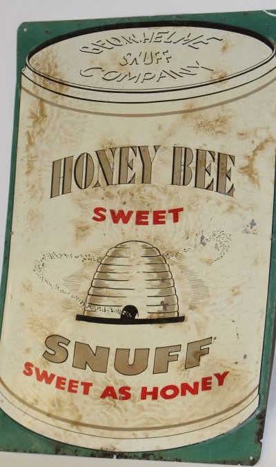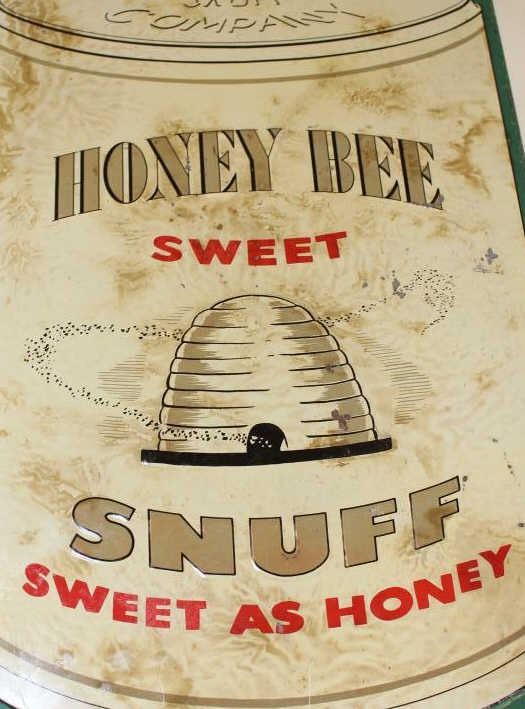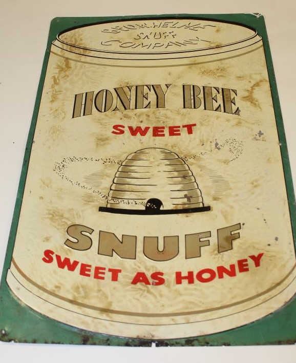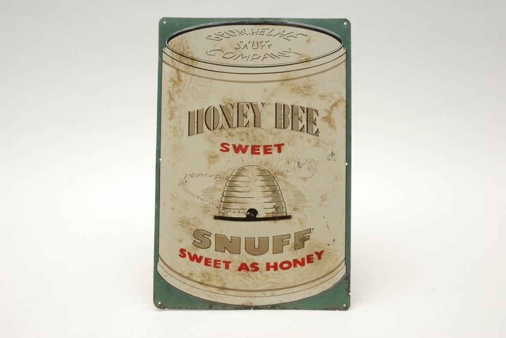 Lot 1450 Honey Bee Snuff advertiser tin sign in good condition. Measures 17 ½” x 11 ½”. Rust at the ends fr