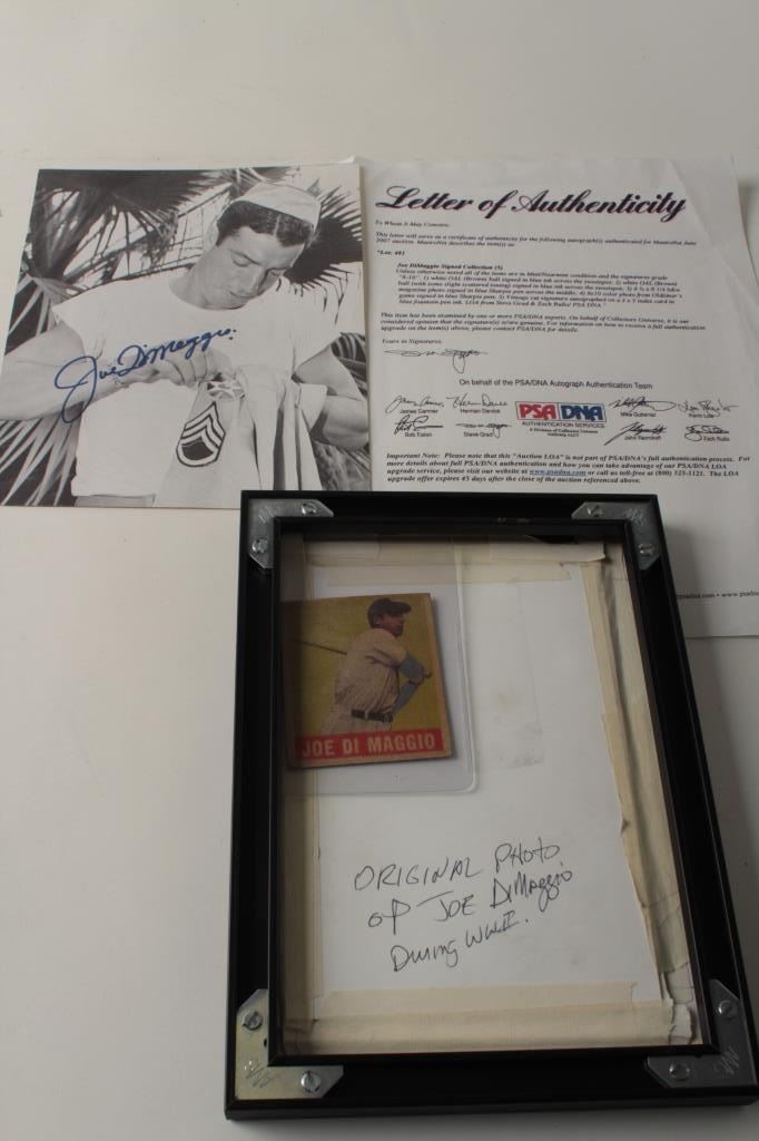 Original photo of Joe Dimaggio during WW II; signed Studio Reproduced photo of Joe, All Star Baseball Gum Card (original). Est.: $75-$150.