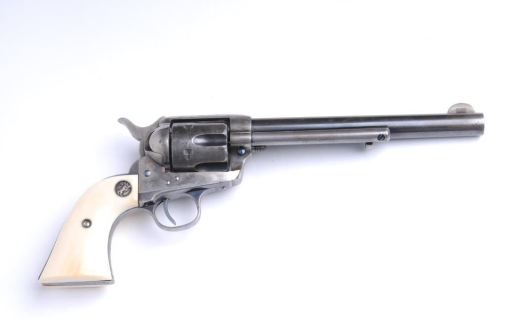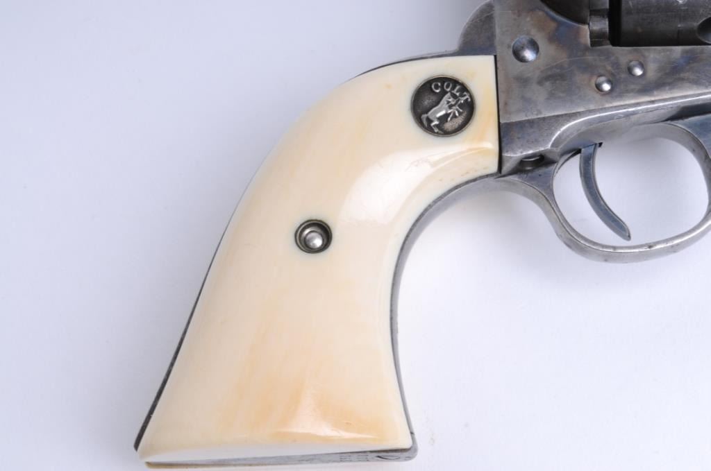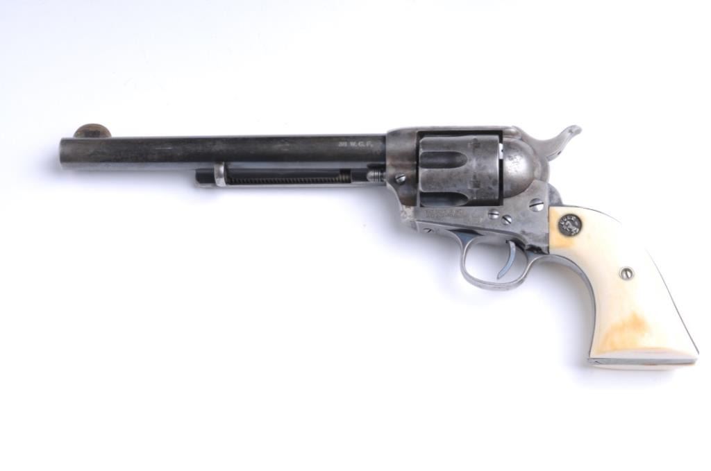 Lot 1460 Colt SAA revolver, .38 W.C.F. caliber, 7.5” barrel, blued and case hardened finish, ivory Colt med