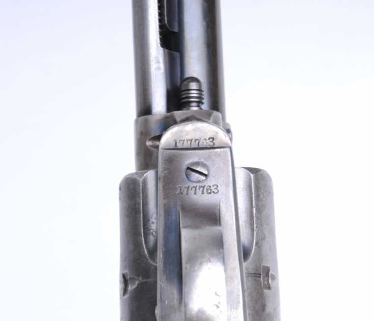 Colt SAA revolver, .38 W.C.F. caliber, 7.5” barrel, blued and case hardened finish, ivory Colt medallion grips, S/N 177763 (ca. 1897), in overall very good to near fine condition displaying considerable original blue finish onthe barrel assembly, original blue in protected areas of the cylinder and straps with areas of original case colors in protected parts of the frame with balance turned to a silver tone; crisp action, fine bore, sharp markings, front sight has been modified with what appears to be an old silver coin; fine grips. (Antique). Est.: $6,000-$8,000.