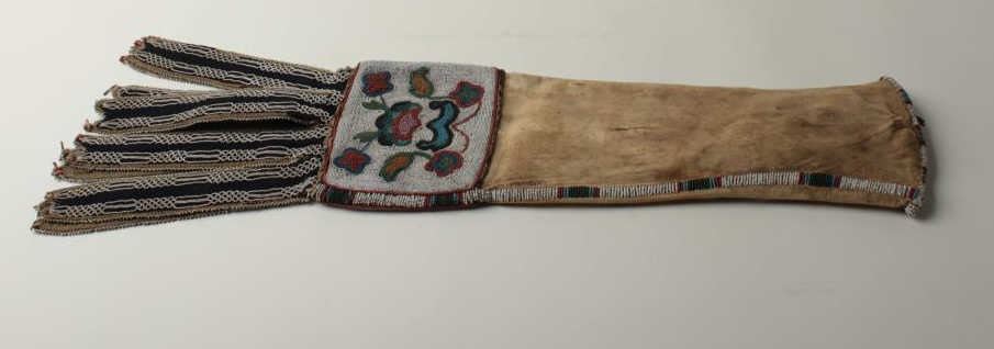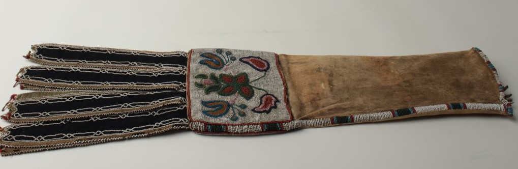 Fine quality beaded pipe bag with floral and fancy beaded bottom fringe on trade cloth. Circa 19th century and in good to very good condition with minor losses and aging. Measures 29” from tip to end and 6 7/8” at widest point. Est.: $3500-$7000