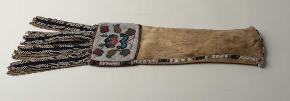 Lot 1462 Fine quality beaded pipe bag with floral and fancy beaded bottom fringe on trade cloth. Circa 19th