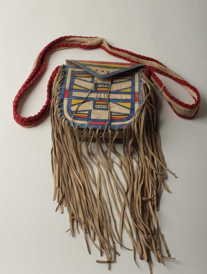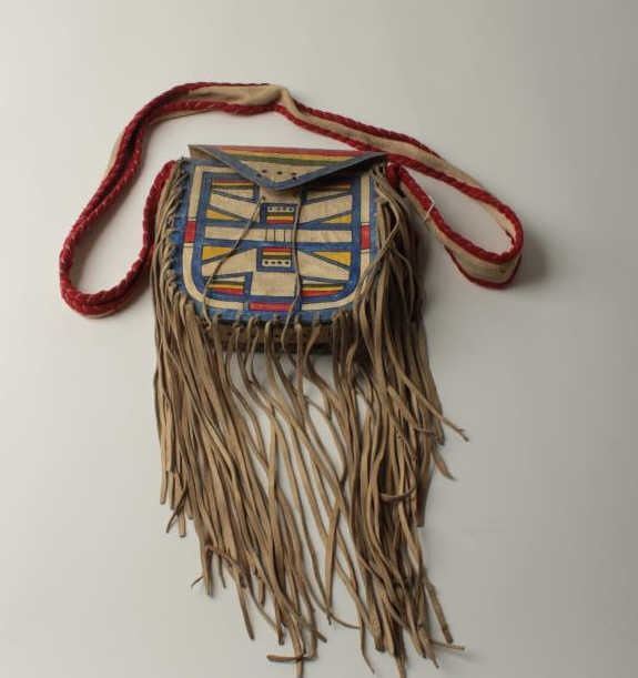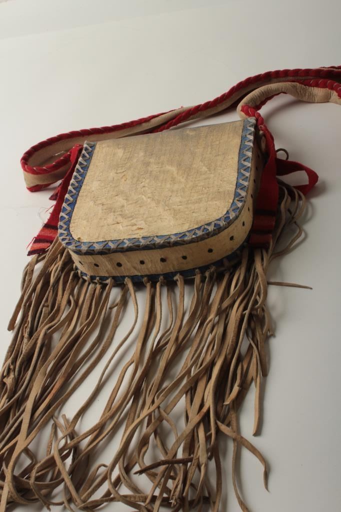 Par fleche and trade cloth bag with rawhide fringe, ca. 1940-50’s; good condition; nice decorator. Est.: $175-$350.