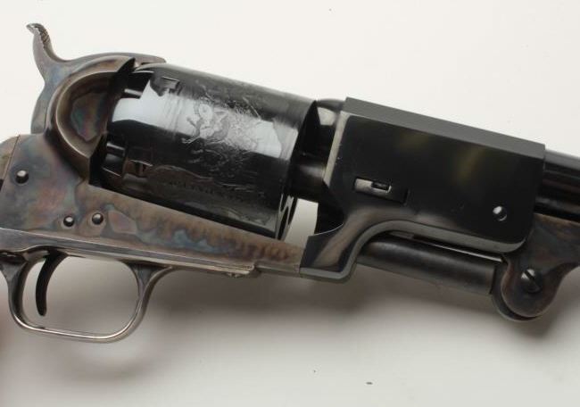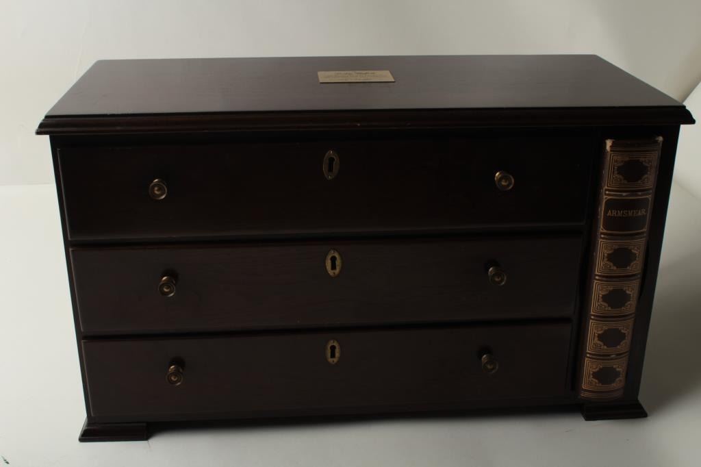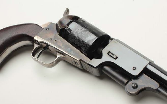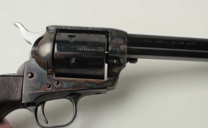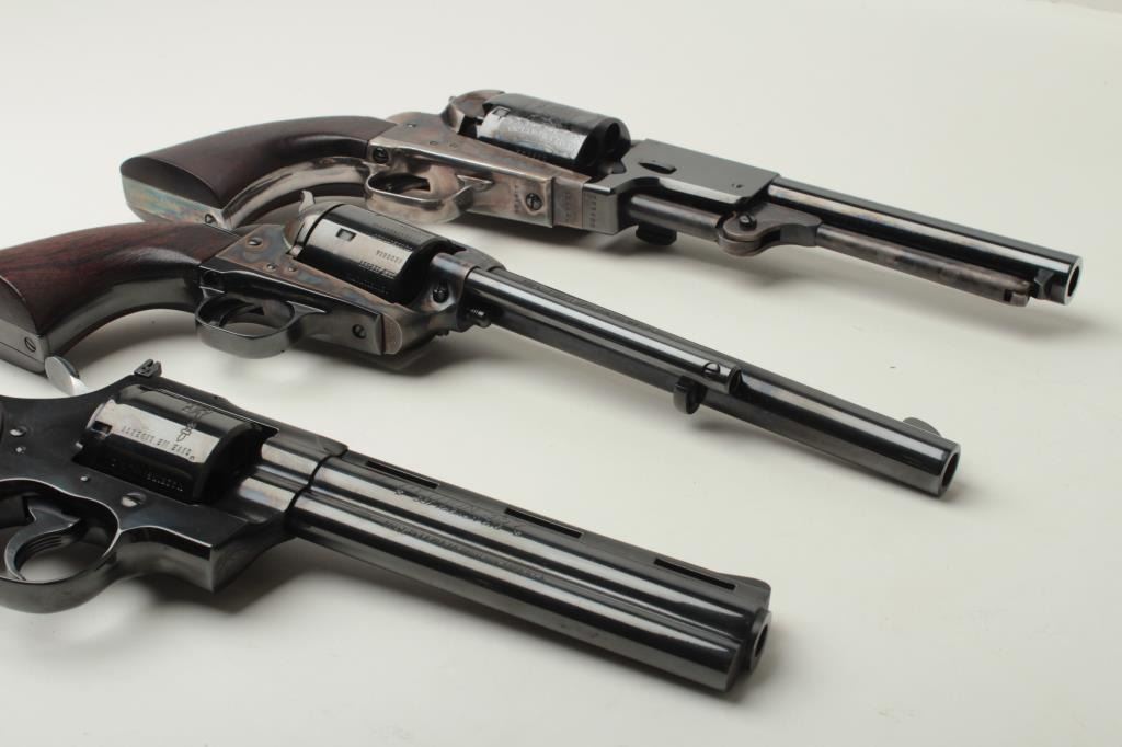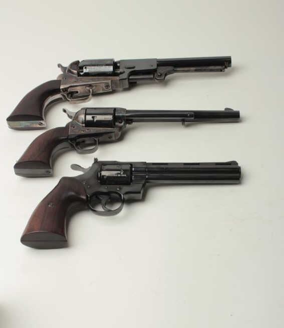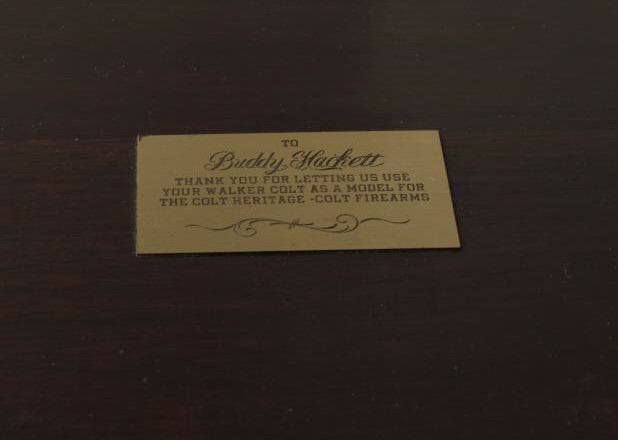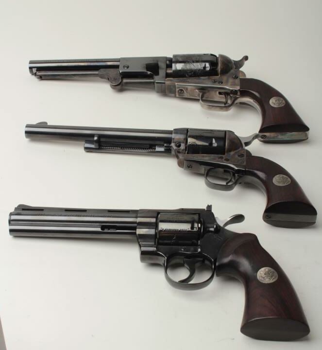 Important Colt Firearms Presentation 3-gun U.S. Bi Centennial (1776-1976) Commemorative Set in three drawer wood casing with a deluxe edition of the re-printed book “Armsmear” that is hand inscribed on the interior page “From Your Friends at ColtFirearms Co./To Buddy Hackett/Thank You for All Your Support thru the Years/Enjoy!”; also with a brass plaque on top of case inscribed “To Buddy Hackett/Thank You for letting Us Use Your Walker Colt as a Model for the Colt Heritage-ColtFirearms”. The set includes a Colt Python DA revolver, .357 Magnum caliber, 6” ventilated rib barrel, blued finish, smooth hardwood grips with U.S. spread eagle emblem in left side of grips, S/N 0094PY; also a Colt SAA revolver, .45 caliber, 7.5” barrel, blued and case hardened finish, smooth hardwood grips with U.S. spread eagle emblem in left side of grips, S/N 0094PM and a Colt New Series Blackpowder 3rd Model percussion Dragoon revolver, .44 caliber, 7.5” barrel, bluedand case hardened finish with silver washed straps, smooth hardwood grips with U.S. spread eagle emblem in left side of grips, S/N 0094DG, with accessories (brass flask, combination wrench, bullet mold, cap tin and key to the locks on each