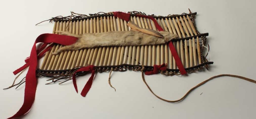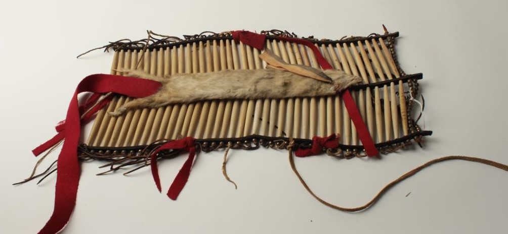 Pipe bone breast plate with brass beads, rawhide fringe and fur trim; approximately 24” x 10” wide, 20th Century for dance and ceremony; not a tourist item but after warfare ceased. Est.: $400-$800.