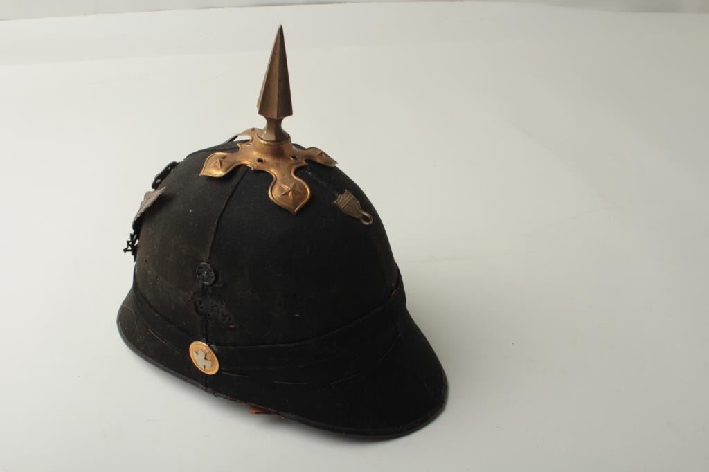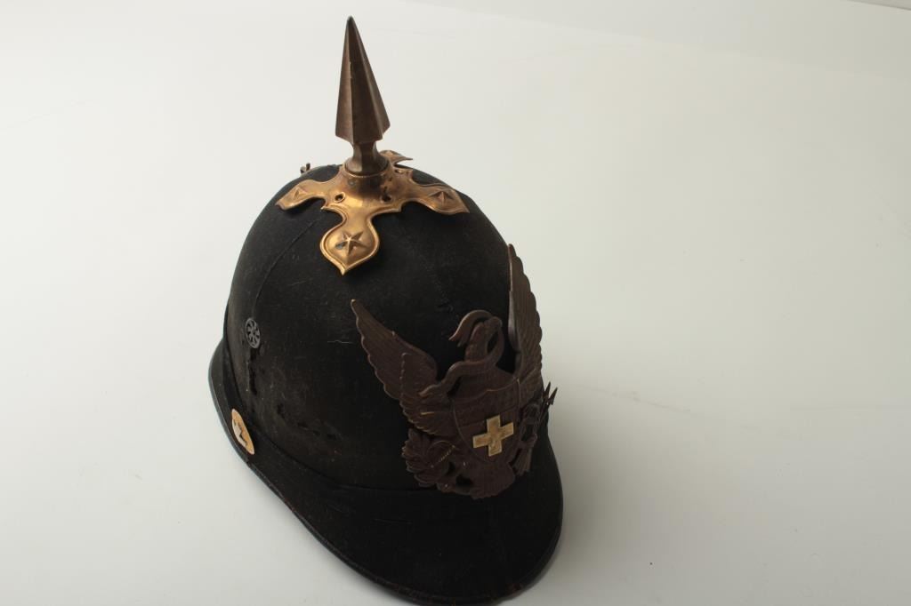 U.S. Shako with eagle plate, ca. 1890-1900’s; replacement emblems for benevolent organization like Salvation Army; body is fair. Est.: $100-$200.