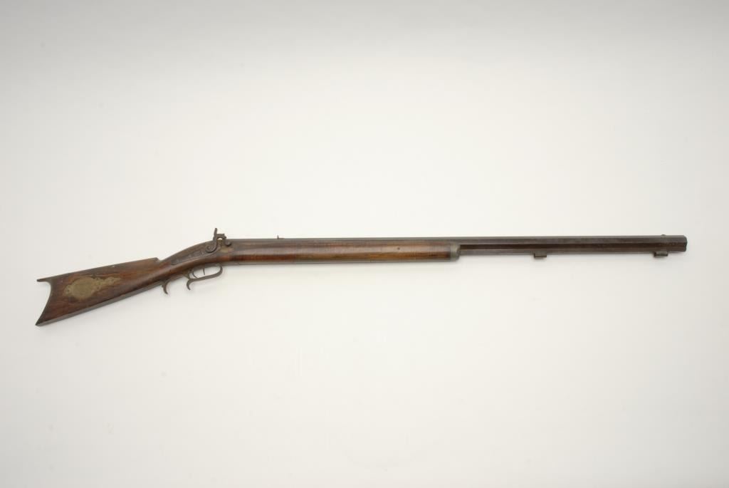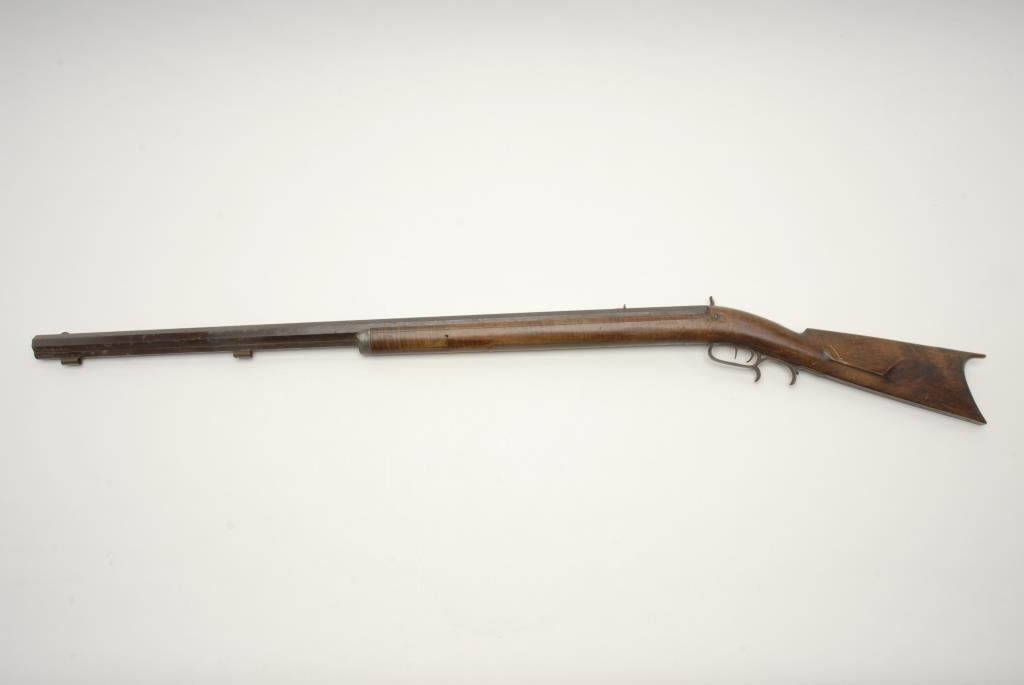 Lot 1486 Heavy barrel percussion plains rifle signed “J.F.” on the barrel with back action lock. Measures 54
