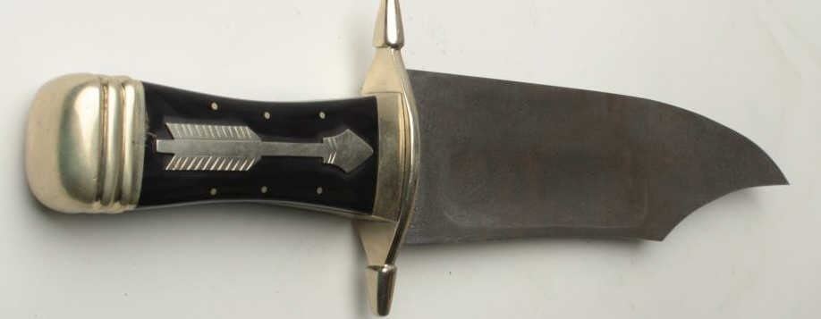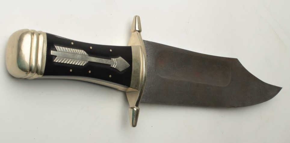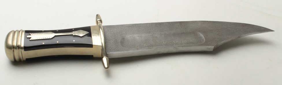 Handmade exhibition size bowie knife with Damascus blade showing arrow signature on the horn grip. Measures 18” overall with a 12” blade. Very heavy stock and massive proportions. German silver mounts and grip cap. The blade is ¼” thick. Alabor of love because at a $1 an hour you would have a couple thousand in time making this knife. Est.: $500-$1000