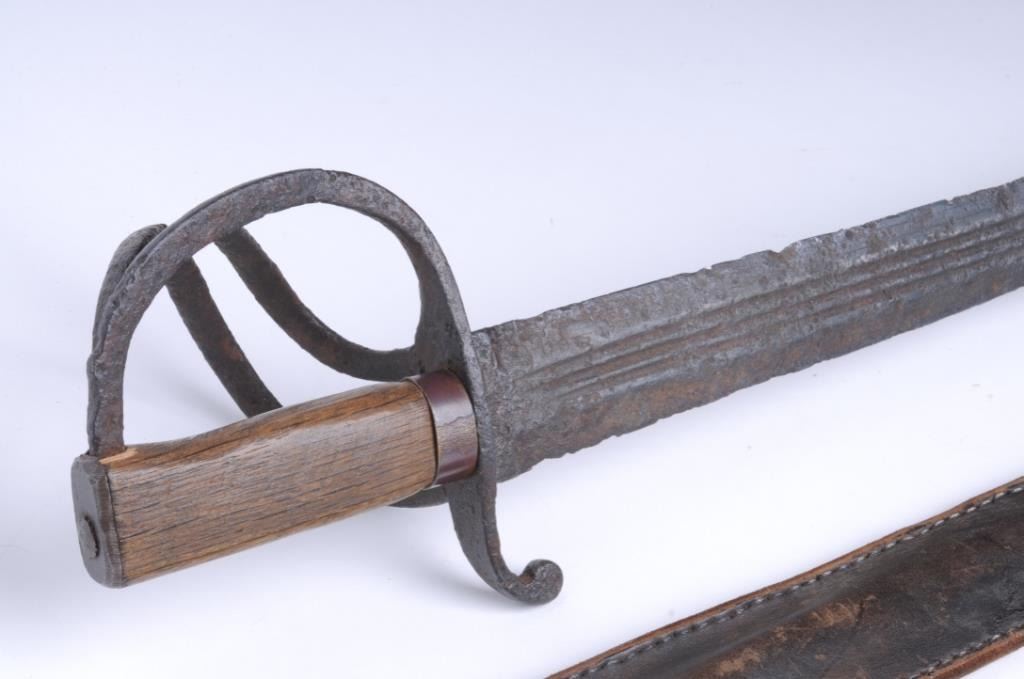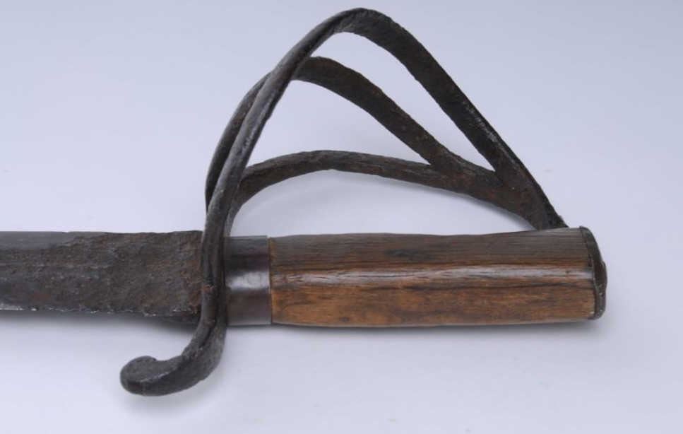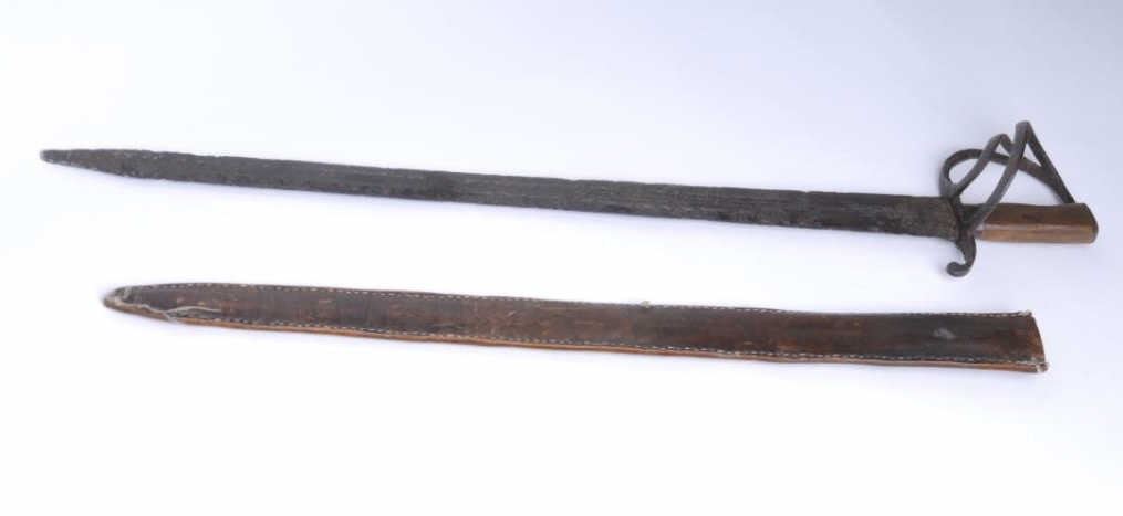 Lot 1497 Early Mexican sword with 3 branch iron guard and wood grips showing early Spanish broadsword blade