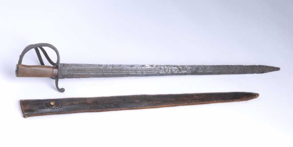 Early Mexican sword with 3 branch iron guard and wood grips showing early Spanish broadsword blade with hand stitched scabbard. This sword is from about the time of the Alamo 1830s. Measures 29 ¼” overall with a 25” blade. In fair to goodcondition with some rust and pitting on the blade that shows use. Est.: $400-$800