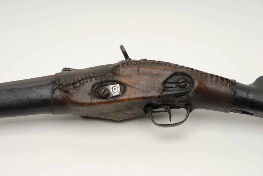 Spanish Military style Miquelet Musket circa late 18th to early 19th century in colonial era. Measures 46 ½” overall with .69 to .70 caliber smoothbore barrel of approximately 31 ½” in length. “CN” at the rear of the lock may be aninspector’s mark. The stock was broken long ago at the wrist and beneath the lock. It has been repaired using heavy leather with hand stitching. The condition is fair to good overall. An interesting an early Spanish colonial era musketof the type used from flintlock to the west coast and south during colonial period. (Antique) Est.: $750-$1500