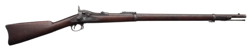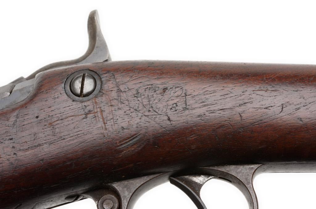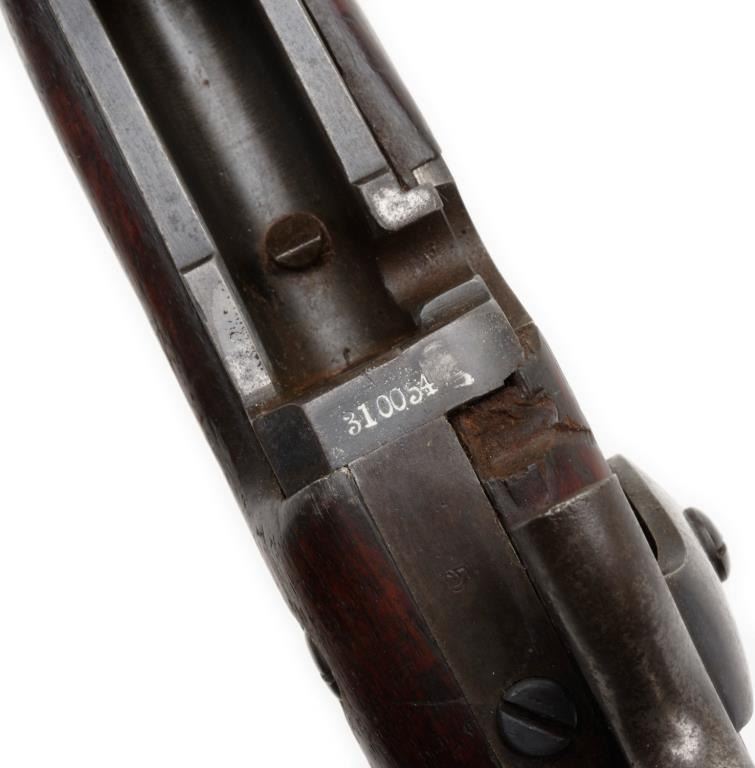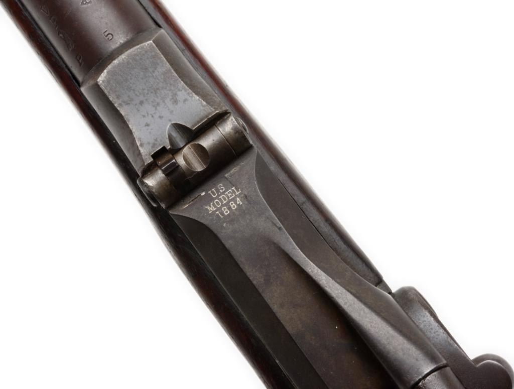 U.S. Springfield Model 1884 trapdoor rifle, .45-70 caliber, 30” barrel, S/N 310054, plum brown patina, wood stock with visible P proof and inspector’s cartouche; some scattered mars to butt stock from storage; overall good to very goodcondition. Est.: $600-$1,200.