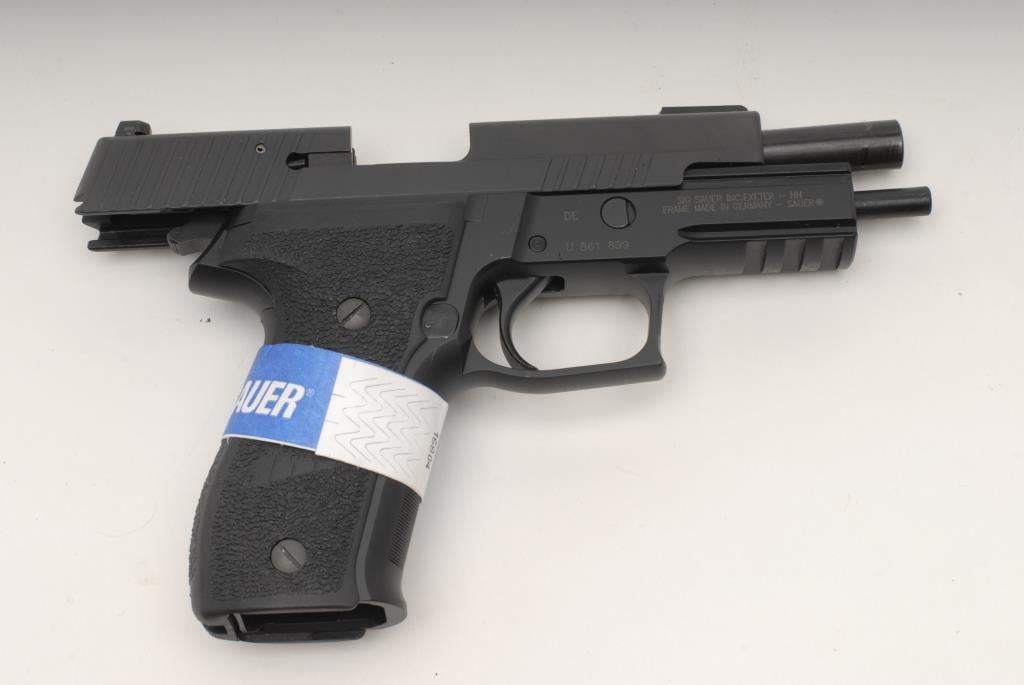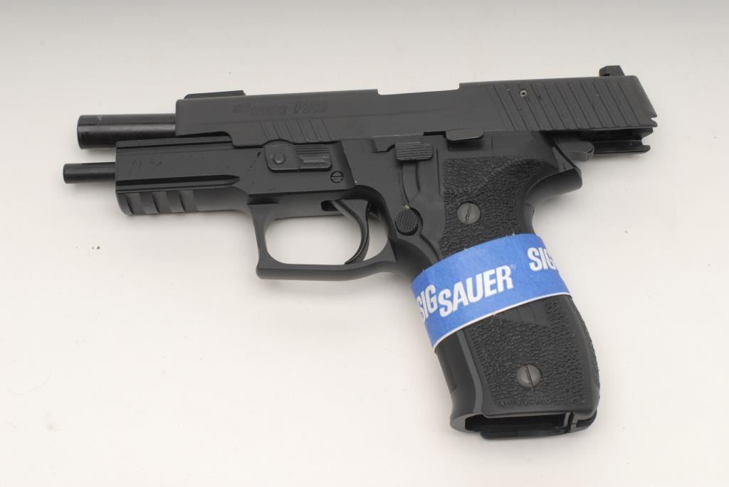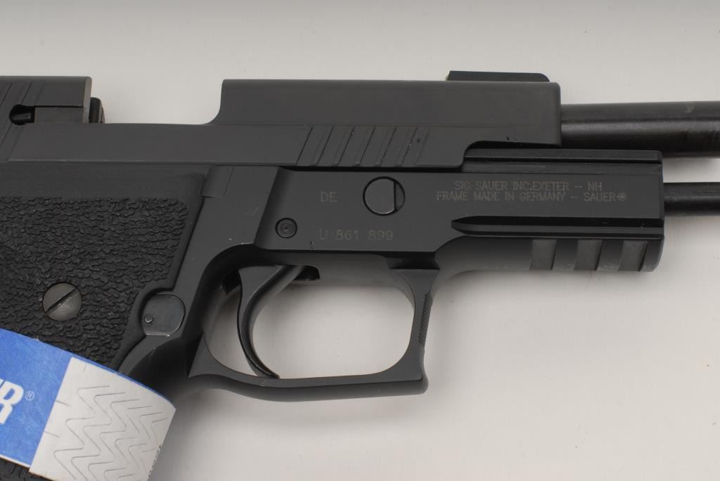 Sig Sauer P226 Semi-Auto pistol, 9mm, 4 ¼” barrel, black finish, night sights, accessory rail, S/N U861899. This pistol remains in like new condition showing little handling and no use. Original box and manual included. Consignor will ship original4 mags to buyer outside of CA. (No CA Sale) Est.: $600-$1200
