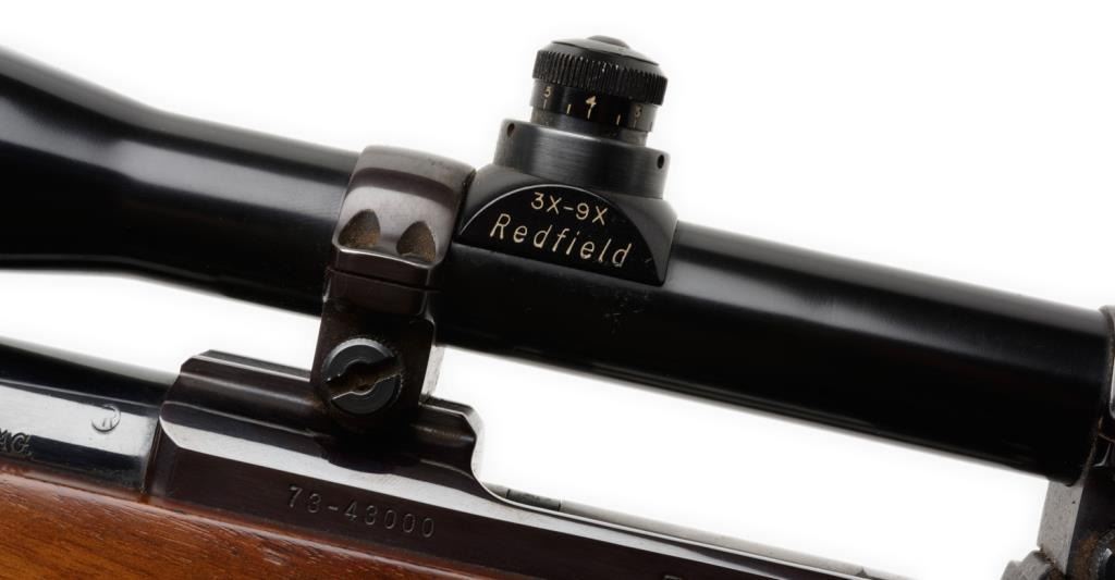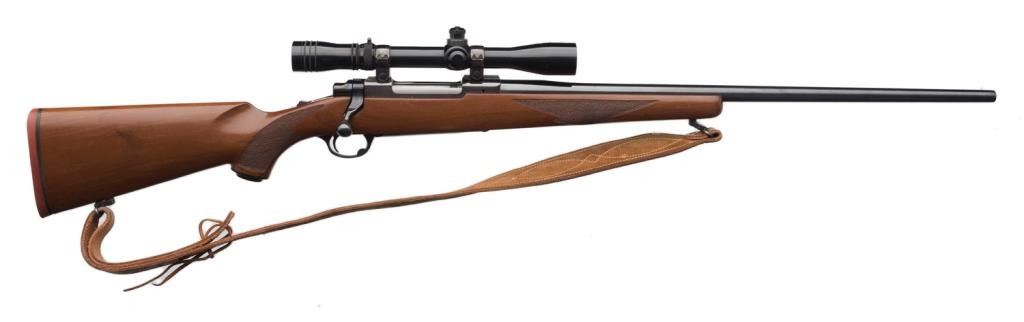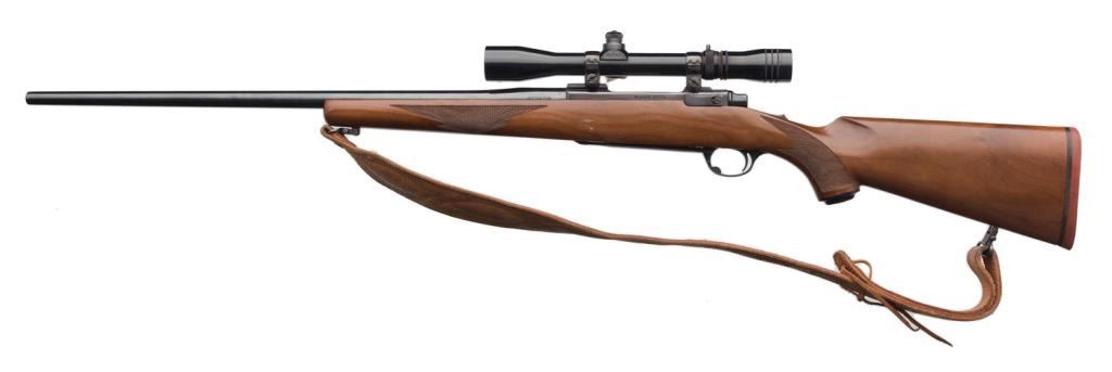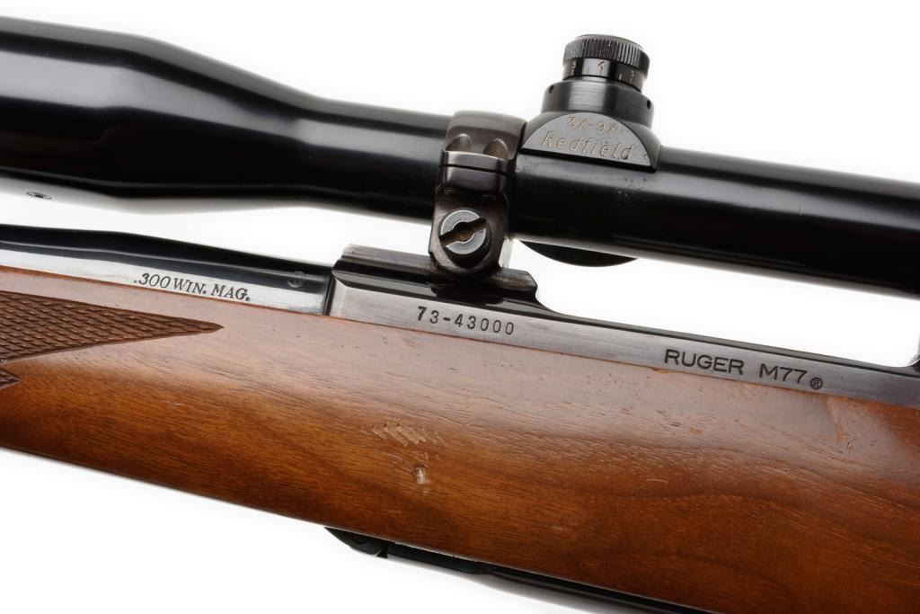 *Ruger Model 77 bolt action rifle, .300 Win. Mag caliber, 24” round barrel, S/N 73-43000, blued finish, checkered wood stock with leather sling and mounted with a Redfield 3X-9X scope displaying crisp optics; in overall fine condition.Est.: $375-$525.