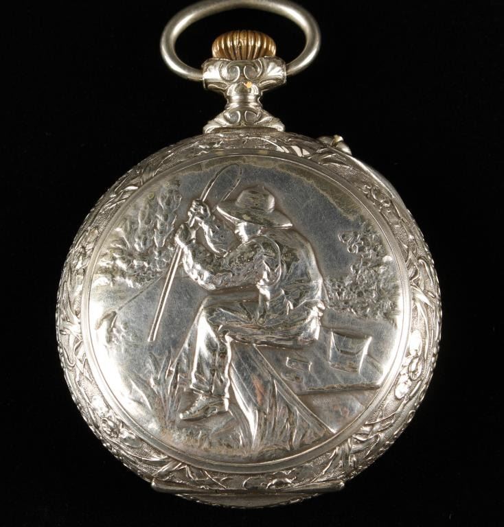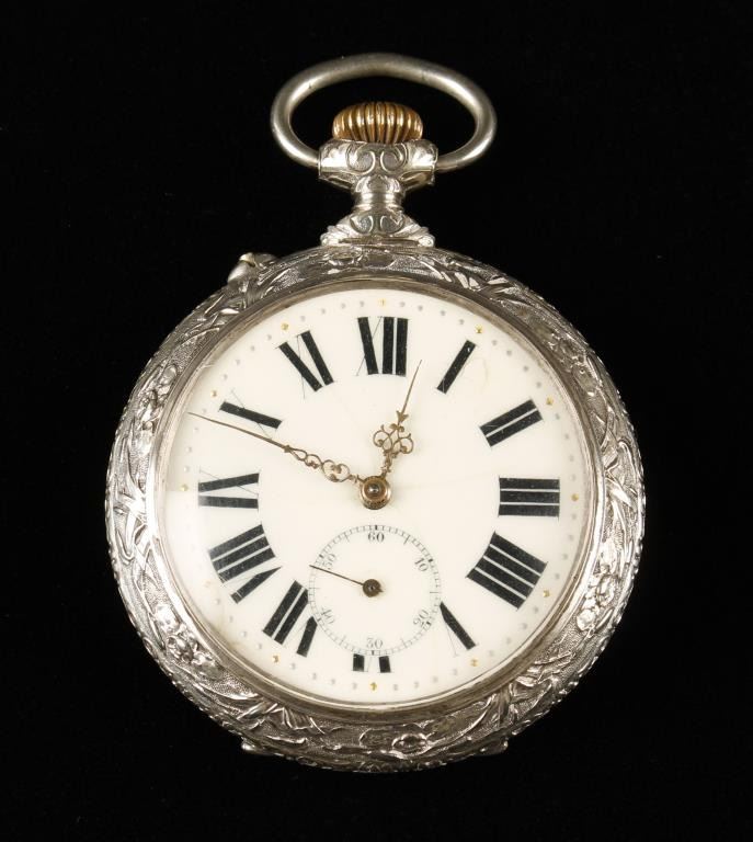 Large fancy open faced pocket watch, approximately 3” in diameter with Roman numeral face; not working at time of description. Est.: $400-$500.