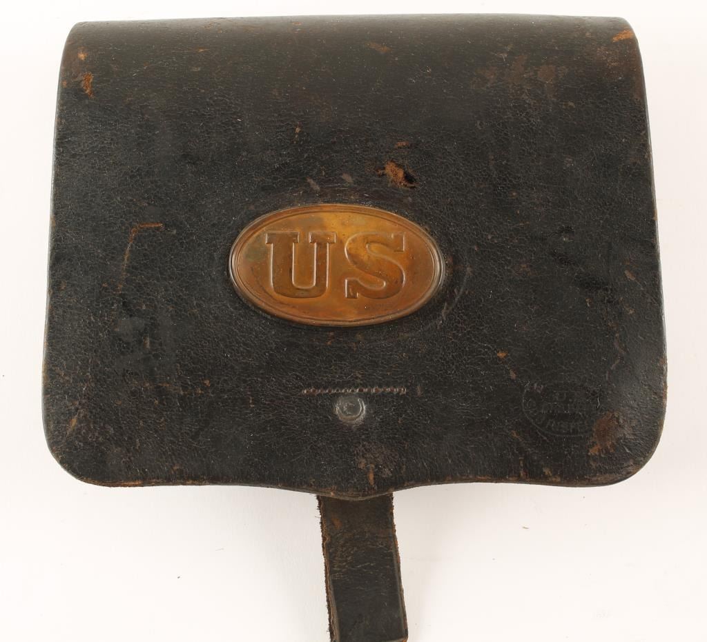 Model 1864 Cartridge Pouch Leather Model 1864 cartridge pouch with oval brass "US" plate over original embossed "US" marking. U.S. sub-inspector's mark stamped on front. Condition: This pouch is in overall very goodcondition with both tin inserts. Leather is good, inside is near new. A very nice example of this model pouch. EST.: $350-$700