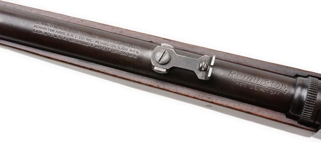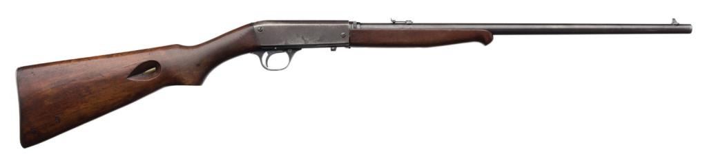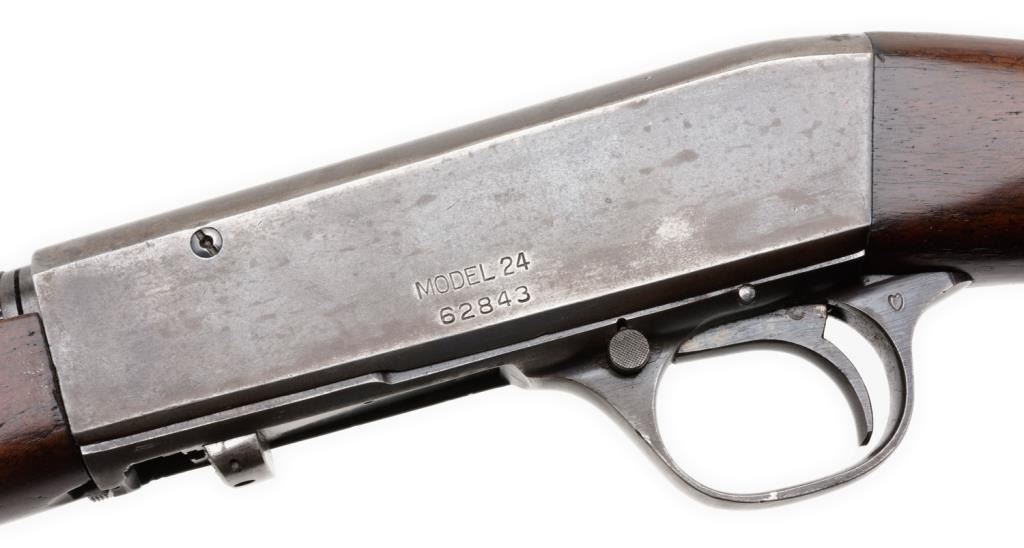 *Remington Model 24 semi-automatic rifle, .22LR caliber, 19” barrel, blued finish, wood stocks in overall very good condition; crisp action, very good bore. Est.: $350-$700.