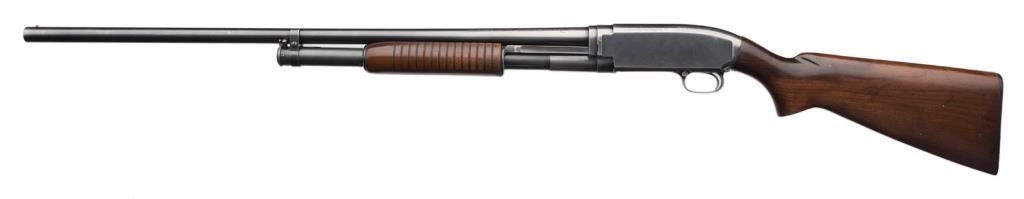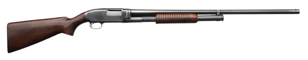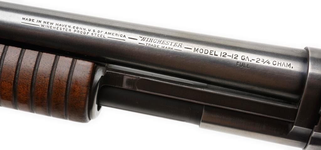 *Winchester Model 12 pump action takedown shotgun, 12 gauge, 30” barrel, S/N 1179843, blued finish, wood stocks in overall very good + condition. Est.: $300-$600.