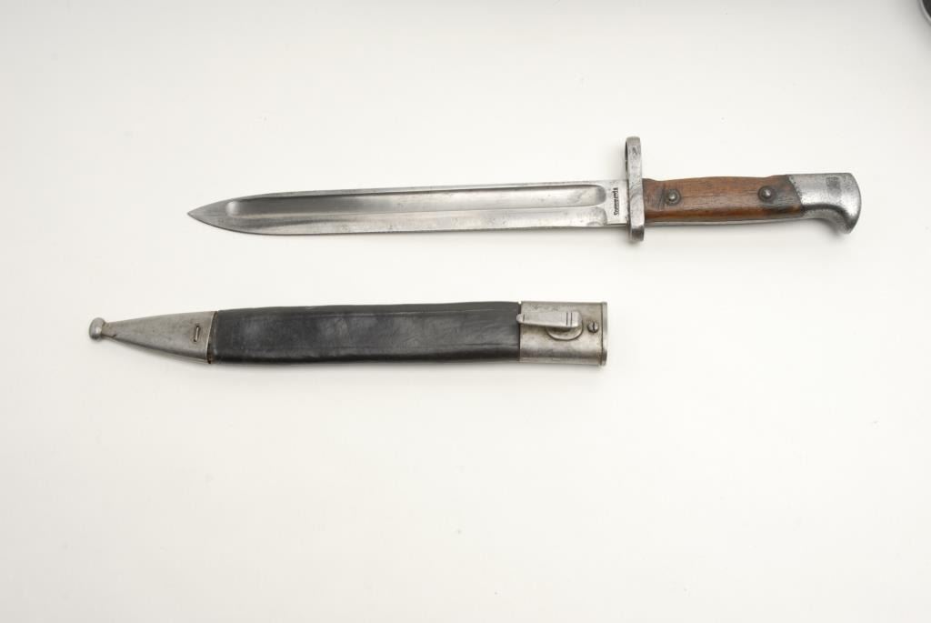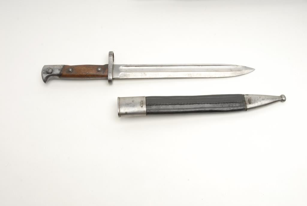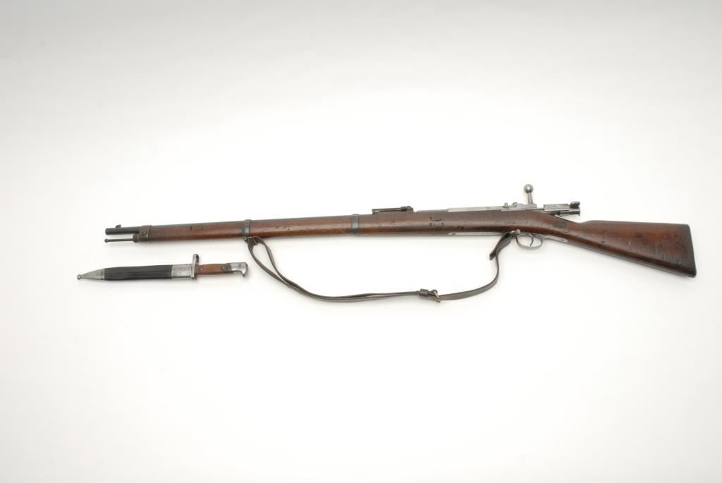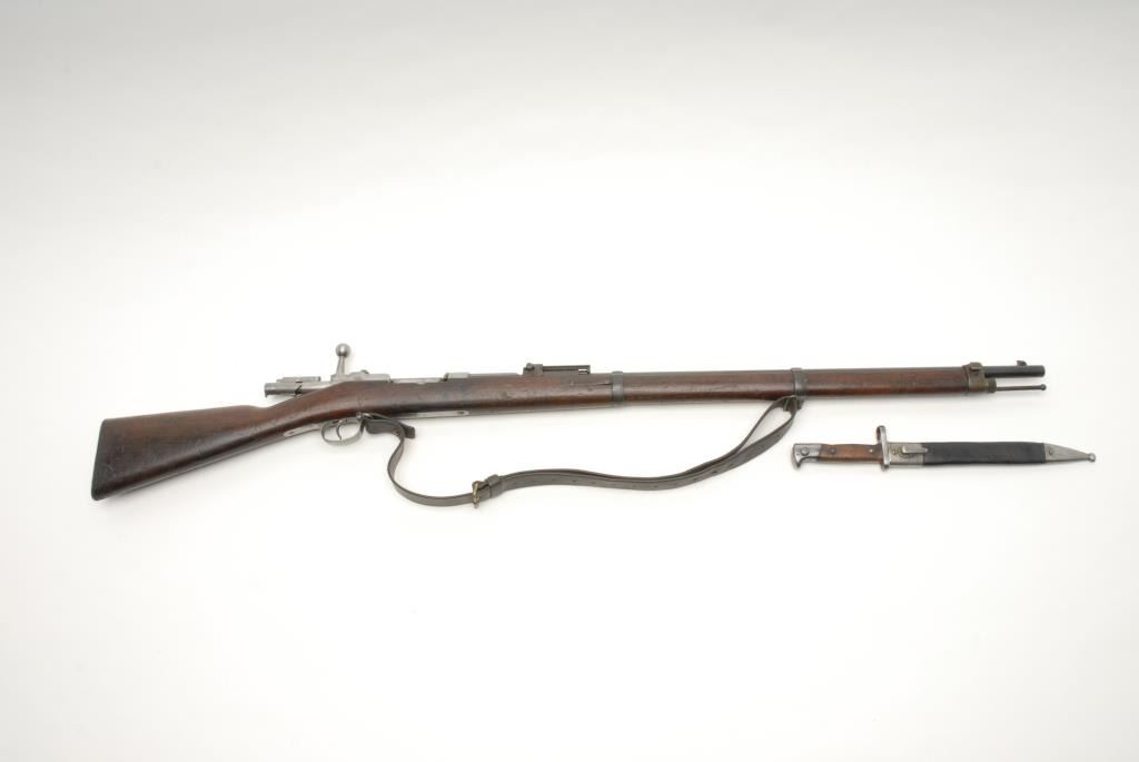Mauser Model 71/84 bolt action rifle, receiver dated 1887, 11mm caliber, 32” barrel, S/N 5607, in overall very good + condition showing the majority of its military finish on the barrel, very good to near fine bore, crisp action andmarkings, very good wood, leather sling and accompanied by a bayonet and iron mounted leather sheath. (Antique). Est.: $500-$1,000.