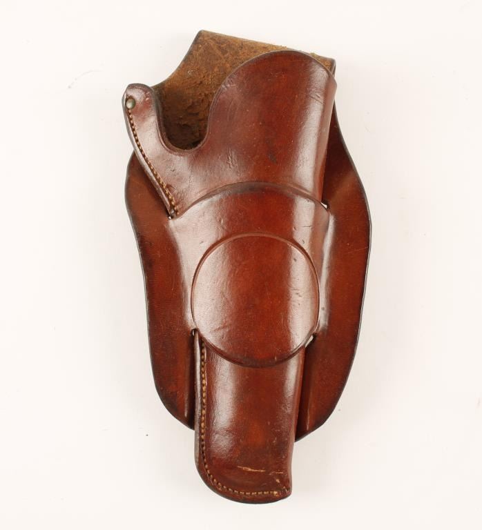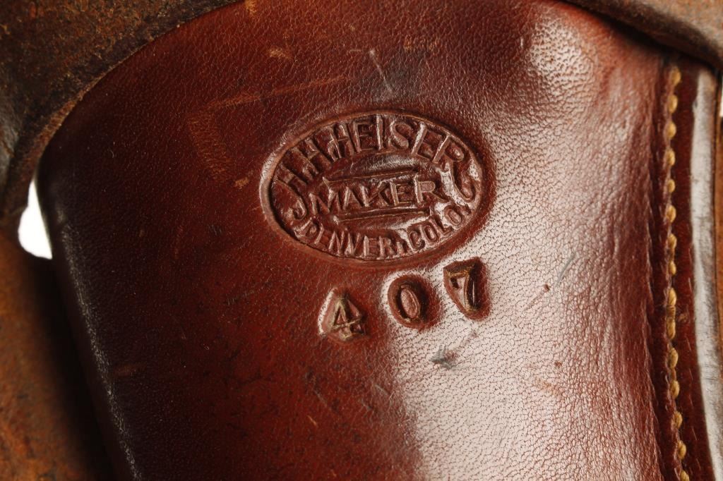 H.H. Heiser, Denver, Colo. Maker Marked Leather Single-Loop Holster for a Single Action revolver with medium length barrel. "407” stamped under the maker’s mark on back of holster body. Condition: This holster is in very good overall condition.EST.: $200-$400