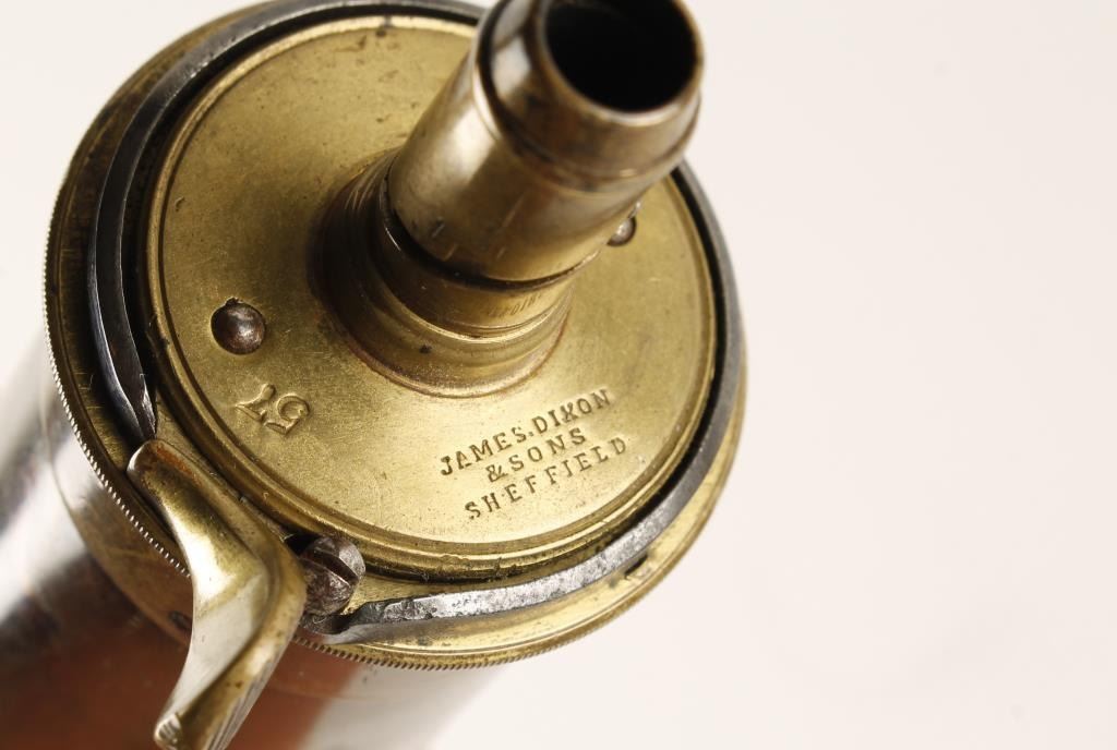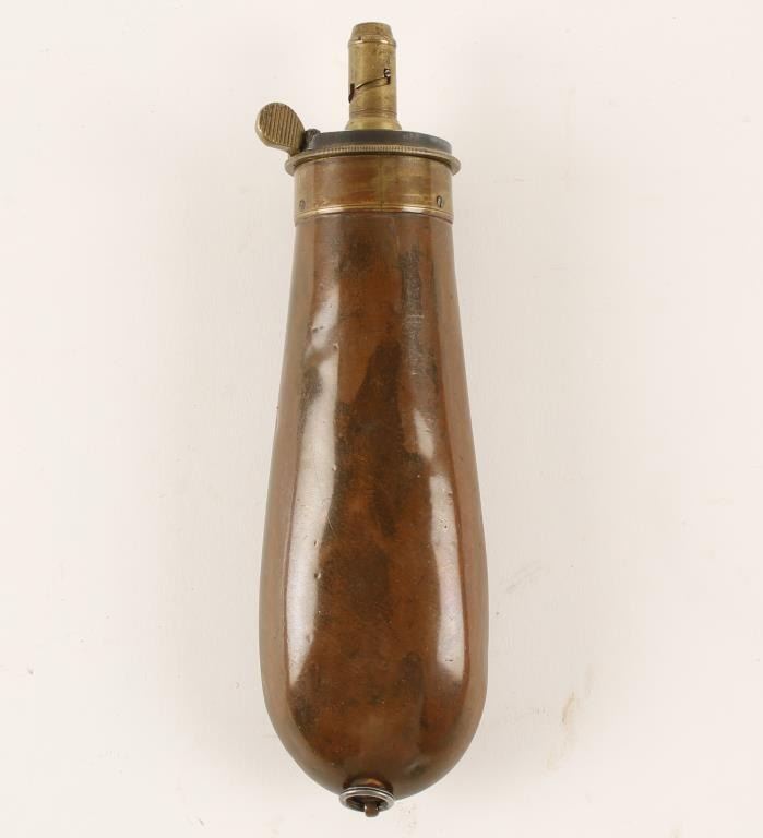 Brass English bag flask marked "James Dixon & Sons, Sheffield" and "57" on top of flask head. Approximately 7" tall with small hanger at bottom of body. Adjustable spout. Condition: This flask is in overall good condition with a pleasingpatina to metal surfaces. Considerable blue is visible on the charging ring and the seam is tight. There are some scattered dings from handling and storage. EST.: $150-$300